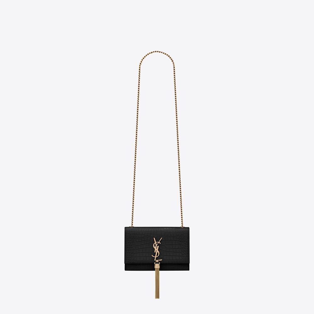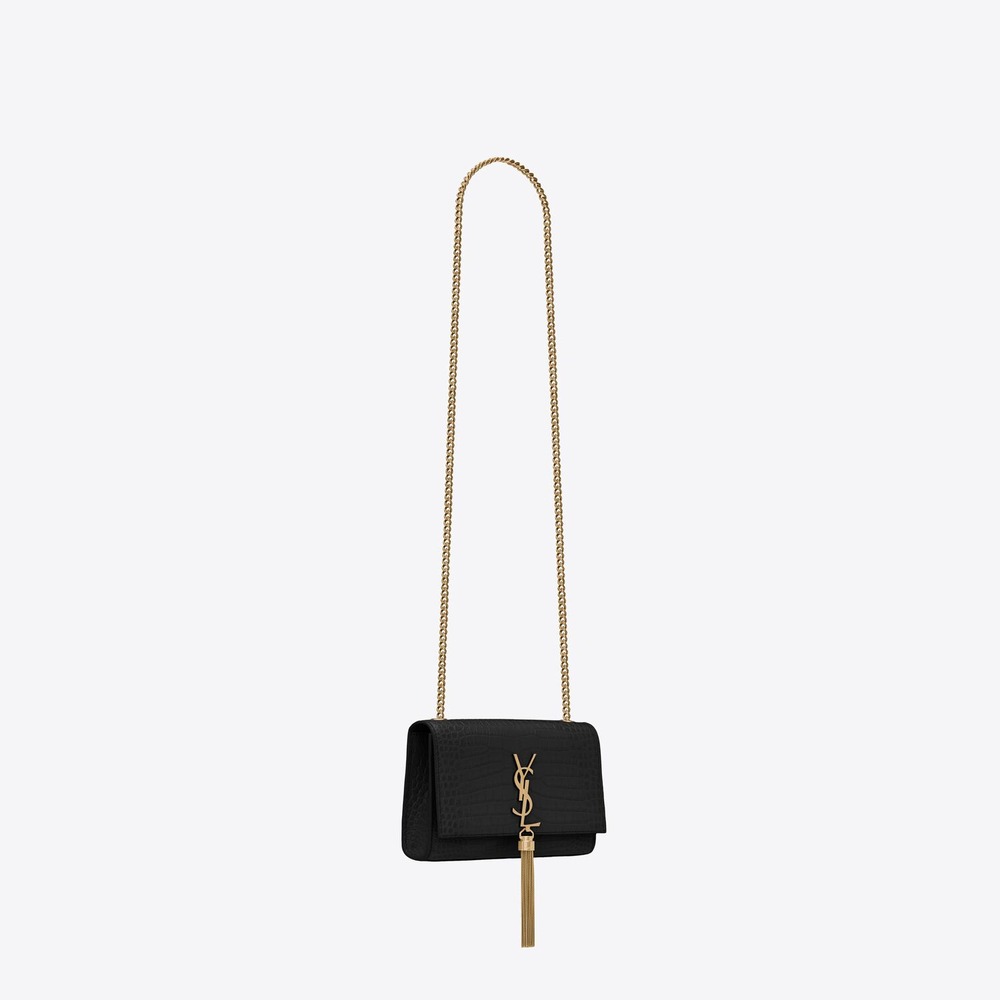 Meet the small, iconic Kate bag, reimagined in shiny crocodile-embossed leather for a luxurious touch. This timeless piece features the iconic Cassandre logo and a chain tassel, adding a touch of sophistication to its design. The long, curb-link chain strap offers versatility, allowing you to wear it in several ways to suit your style.