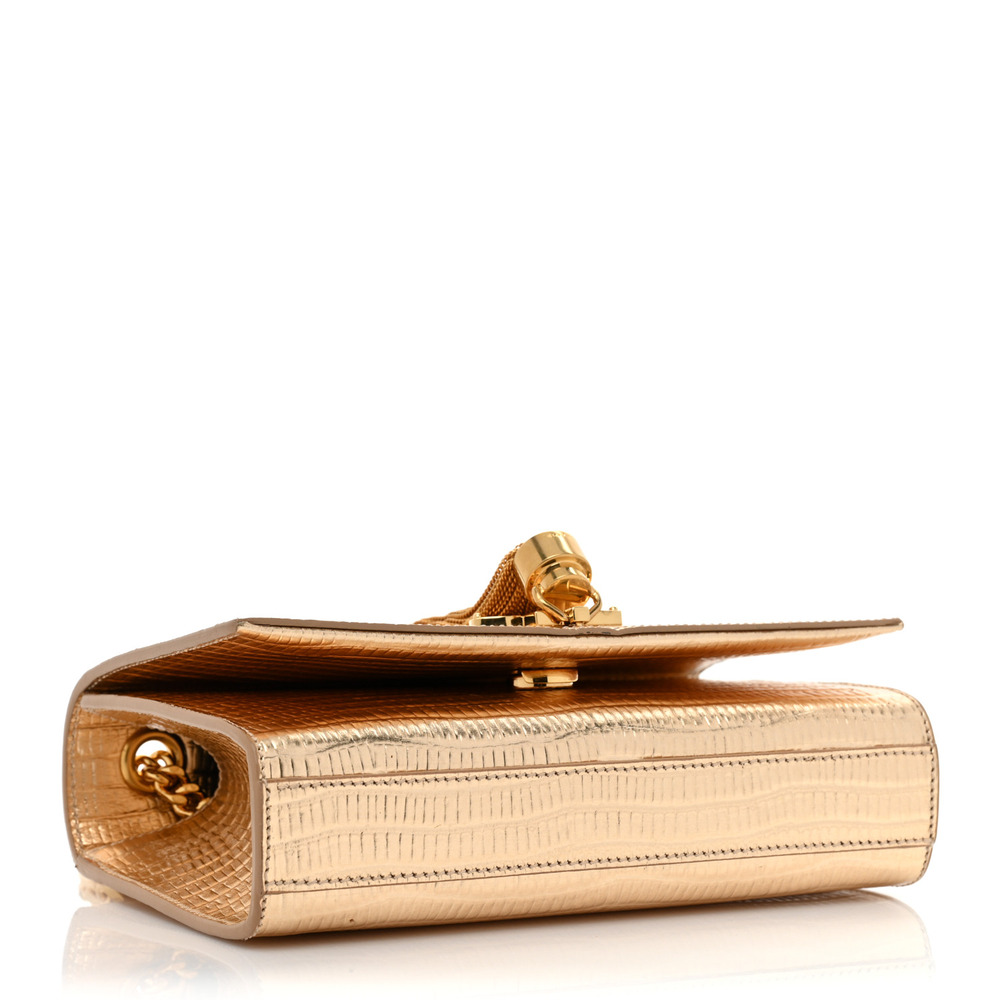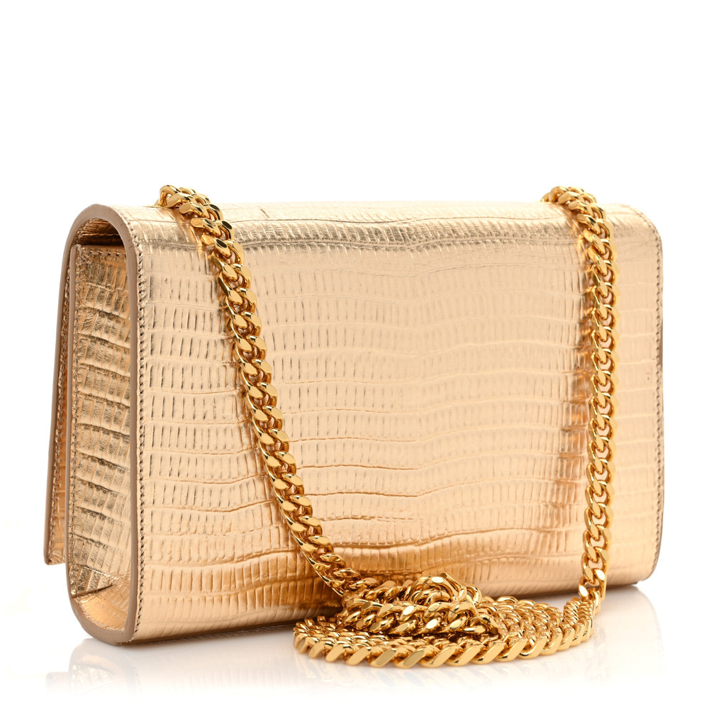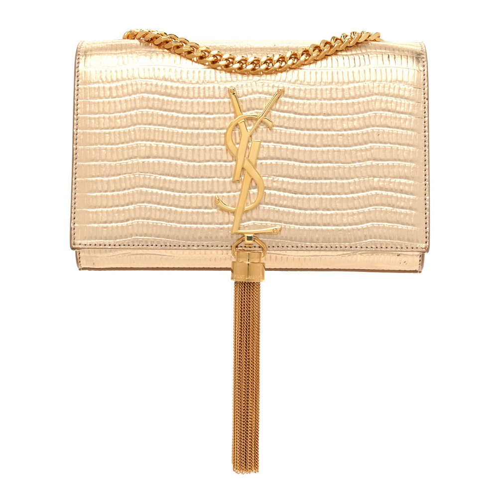 Meet the small, iconic Kate bag, reimagined in shiny crocodile-embossed leather for a luxurious touch. This timeless piece features the iconic Cassandre logo and a chain tassel, adding a touch of sophistication to its design. The long, curb-link chain strap offers versatility, allowing you to wear it in several ways to suit your style.