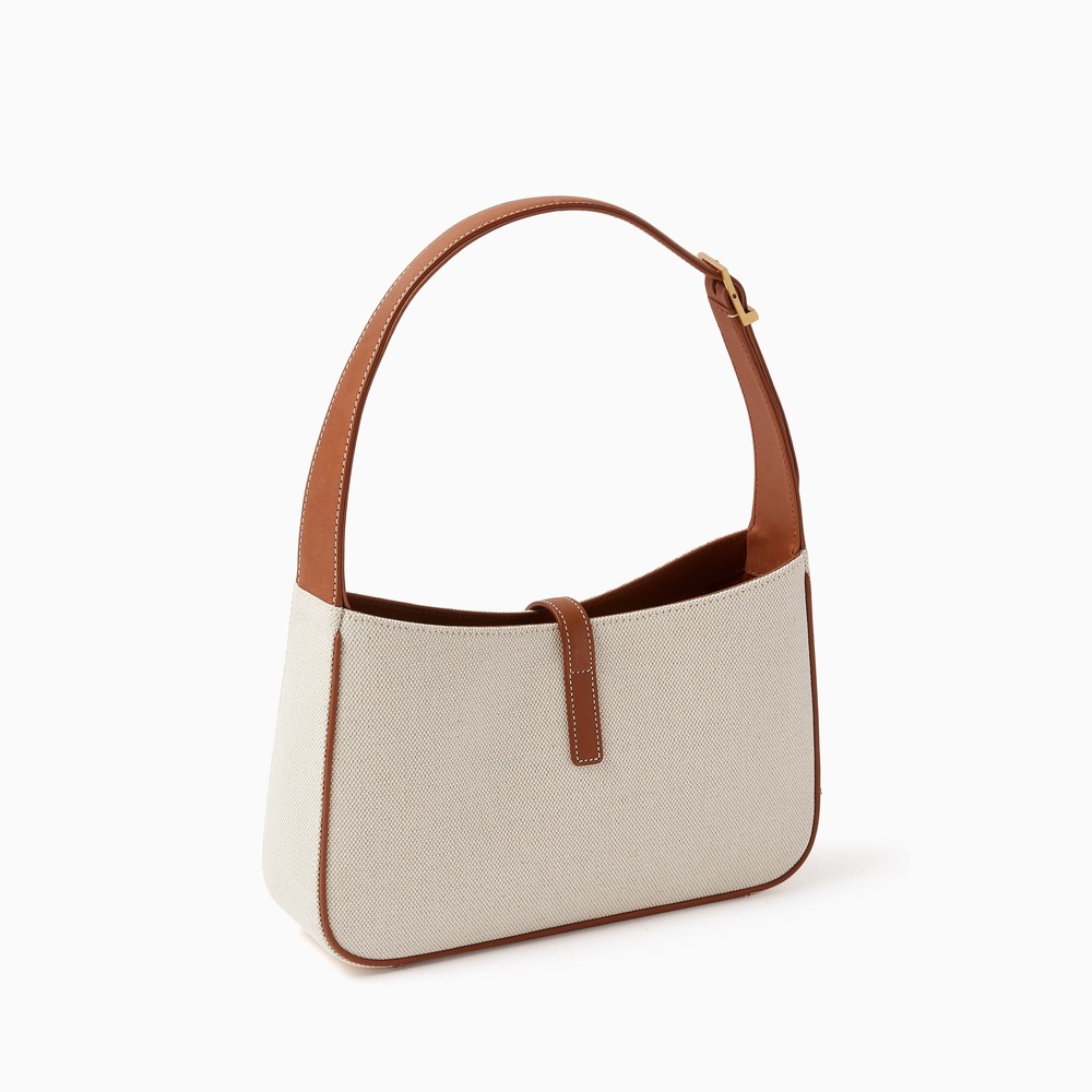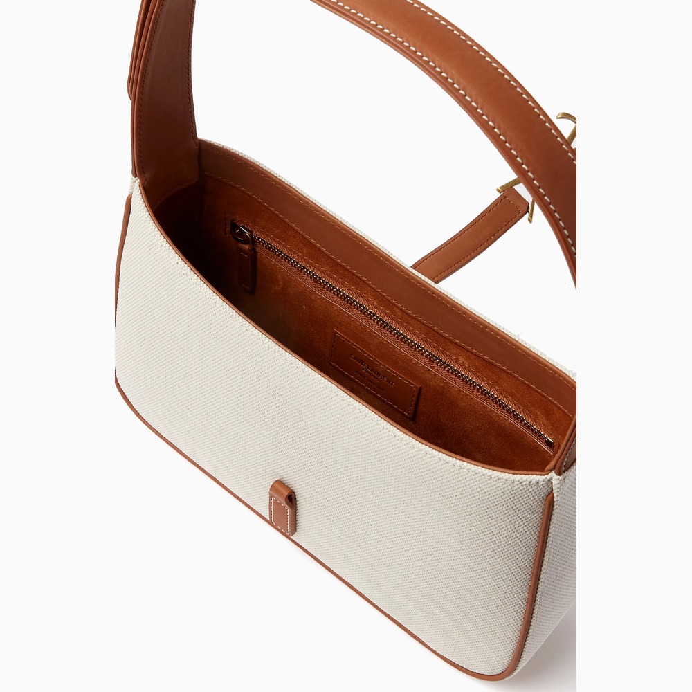 Crafted from smooth calfskin leather in tan, this elegant shoulder bag exudes sophistication. It features an adjustable shoulder strap for versatile wear. The front showcases a prominent gold YSL monogram cross strap that opens to reveal a luxurious brown suede leather interior with a zipper pocket for organization.