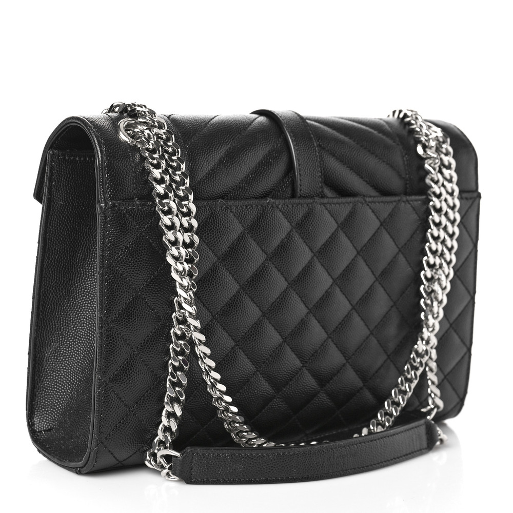 This large enveloped flap bag is crafted from grain de poudre embossed leather, featuring Chevron and diamond quilt overstitching for a sophisticated look. Structured yet spacious, it serves as an elegant shoulder bag. Made with chrome and metal-free tanned leather, it ensures sustainability. The grosgrain lining and light bronze brass hardware add luxurious touches. The magnetic snap tab closure secures the interior, which includes a zipped pocket for organization. Dimensions are 12.2 x 8.6 x 2.9 inches, with a chain length ranging from 11.8 to 20.4 inches. Made from 100% calfskin leather in Italy.