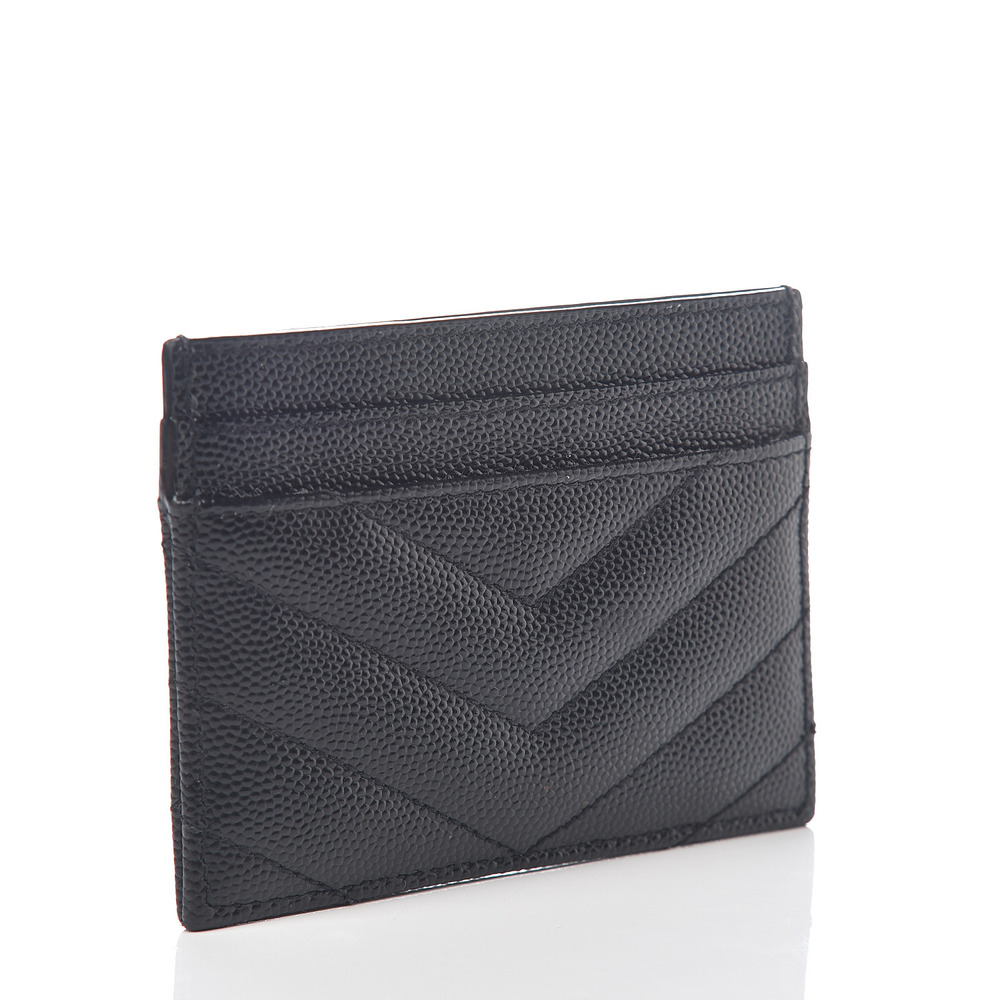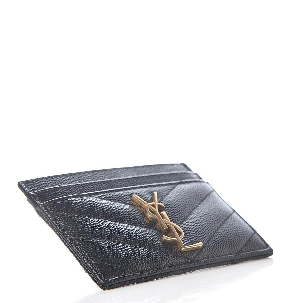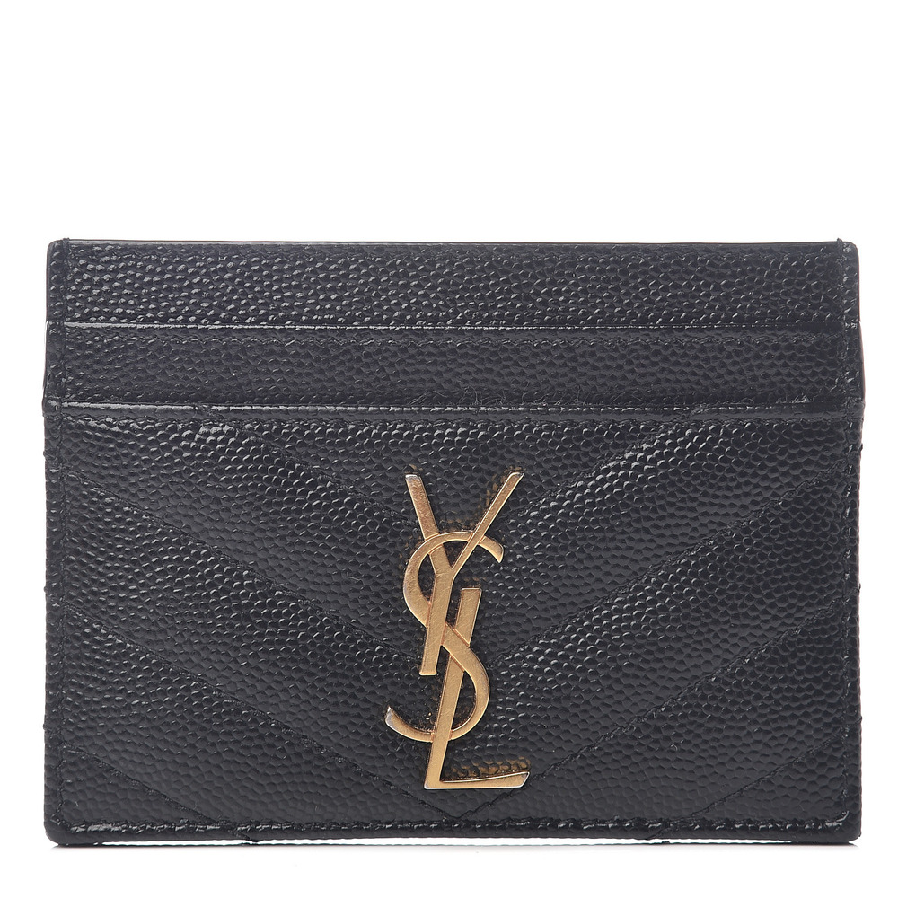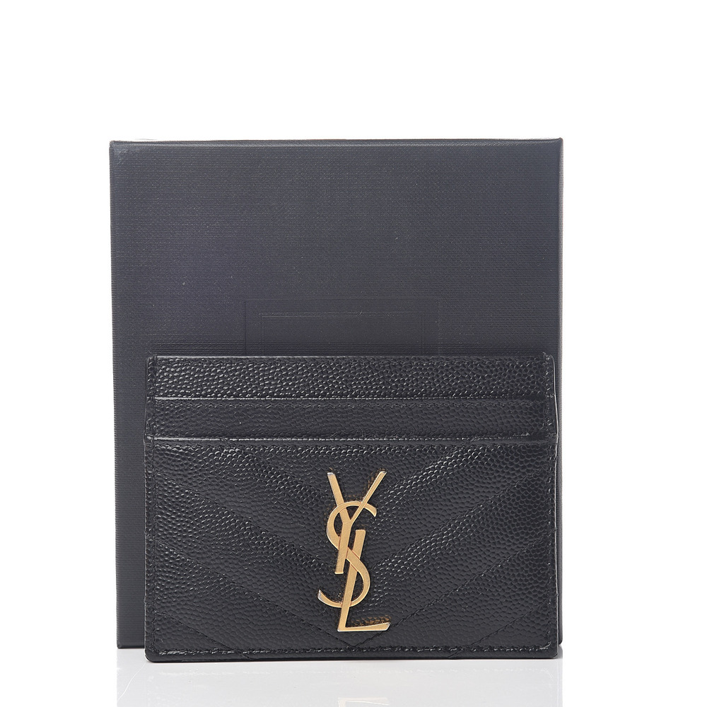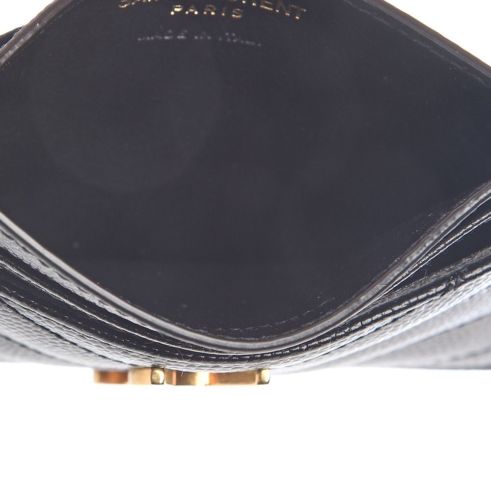 This chic and petite wallet is crafted of grained calfskin leather in black. The case features a prominent gold tone YSL logo and has multiple card slots. This is an excellent case that is practical and chic, with the classic style of Saint Laurent!