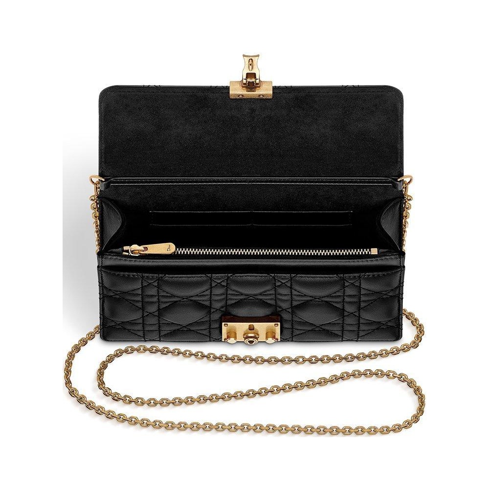 A black leather wallet on chain with a Dior logo charm and a chain strap. The interior of the bag is lined in suede and has multiple compartments for storing your essentials.