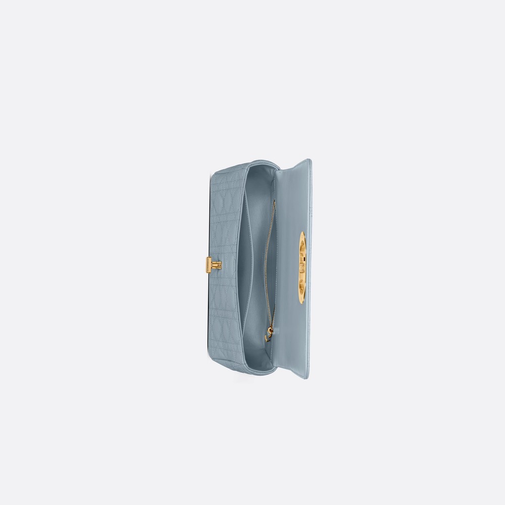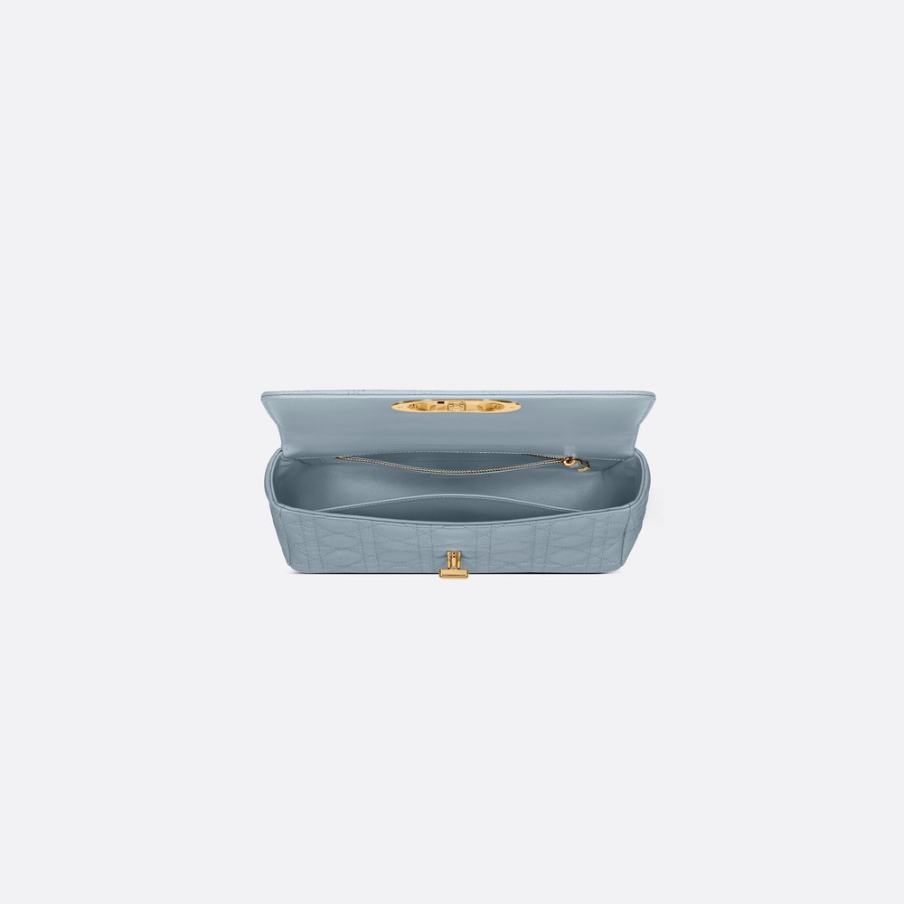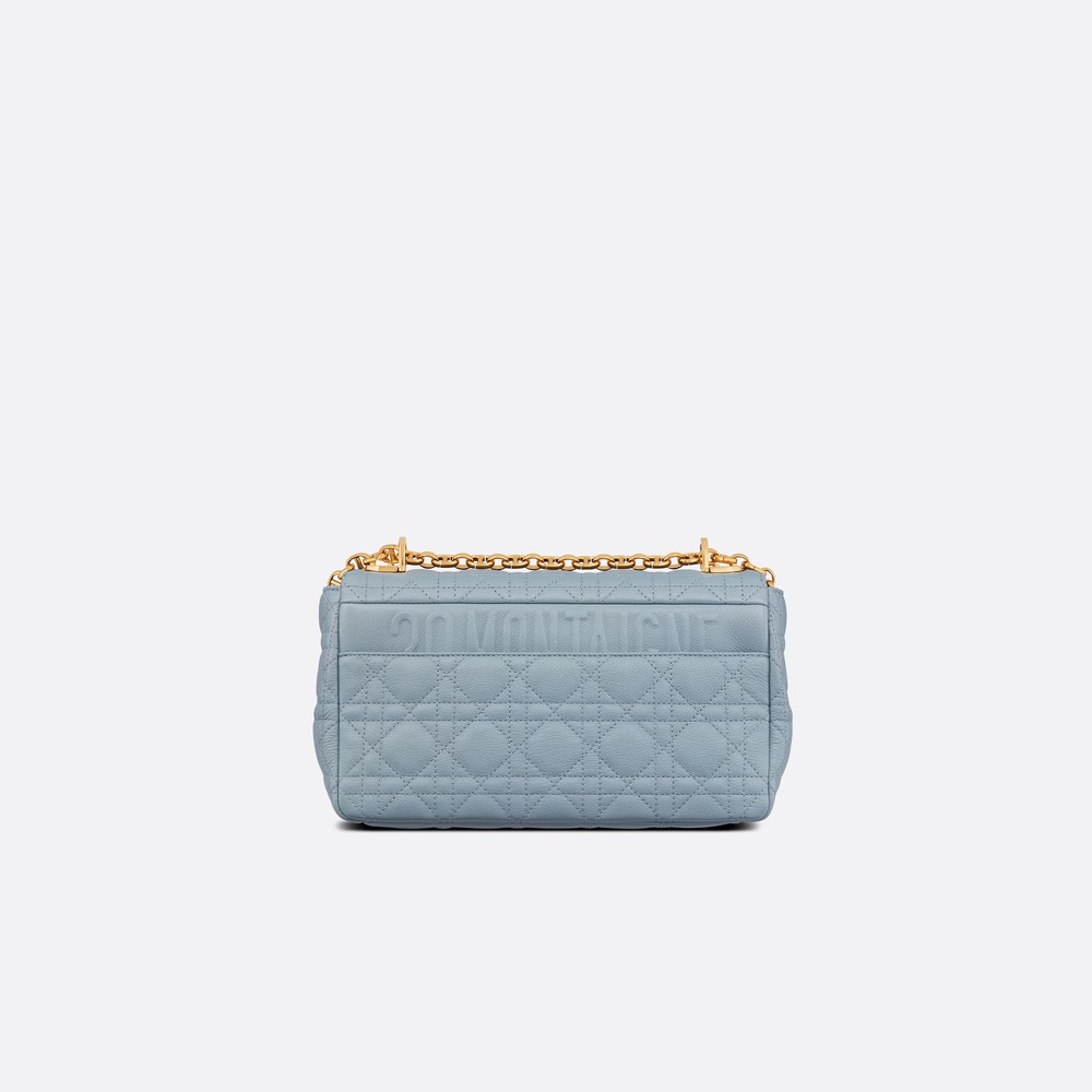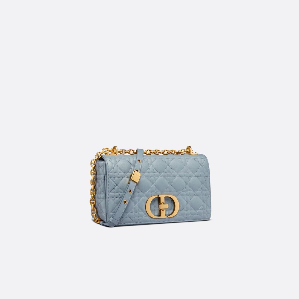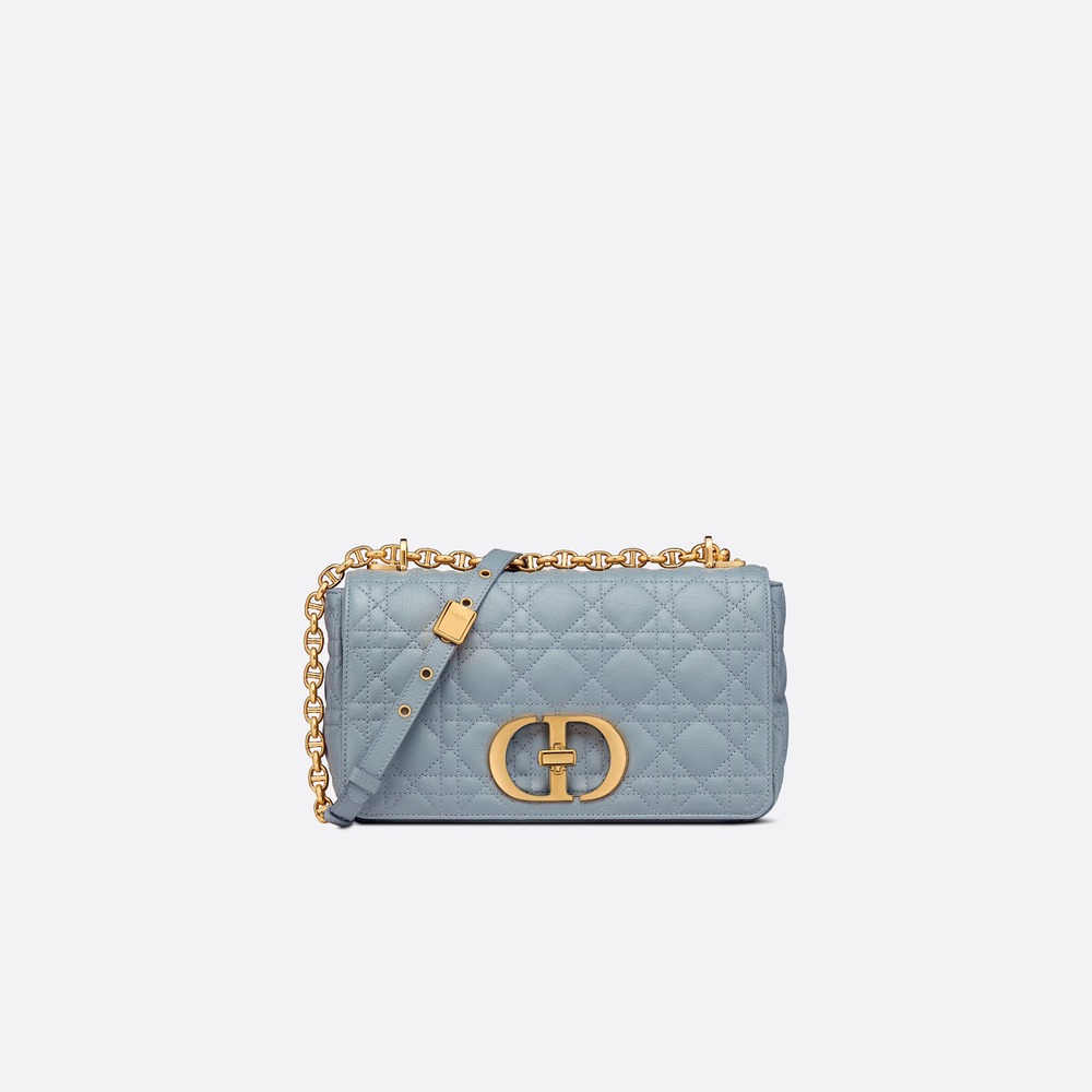 The Dior Caro bag combines modernity with timeless elegance. The silhouette is crafted in ethereal gray supple calfskin with Cannage topstitching. The supple bag features a flap adorned with an antique gold-finish metal CD twist clasp, inspired by the seal of a Christian Dior perfume bottle. The detachable chain shoulder strap with CD signature links allows the medium bag to be carried by hand or worn over the shoulder and may be replaced by one of the House’s wide embroidered straps for day or evening attire wear.