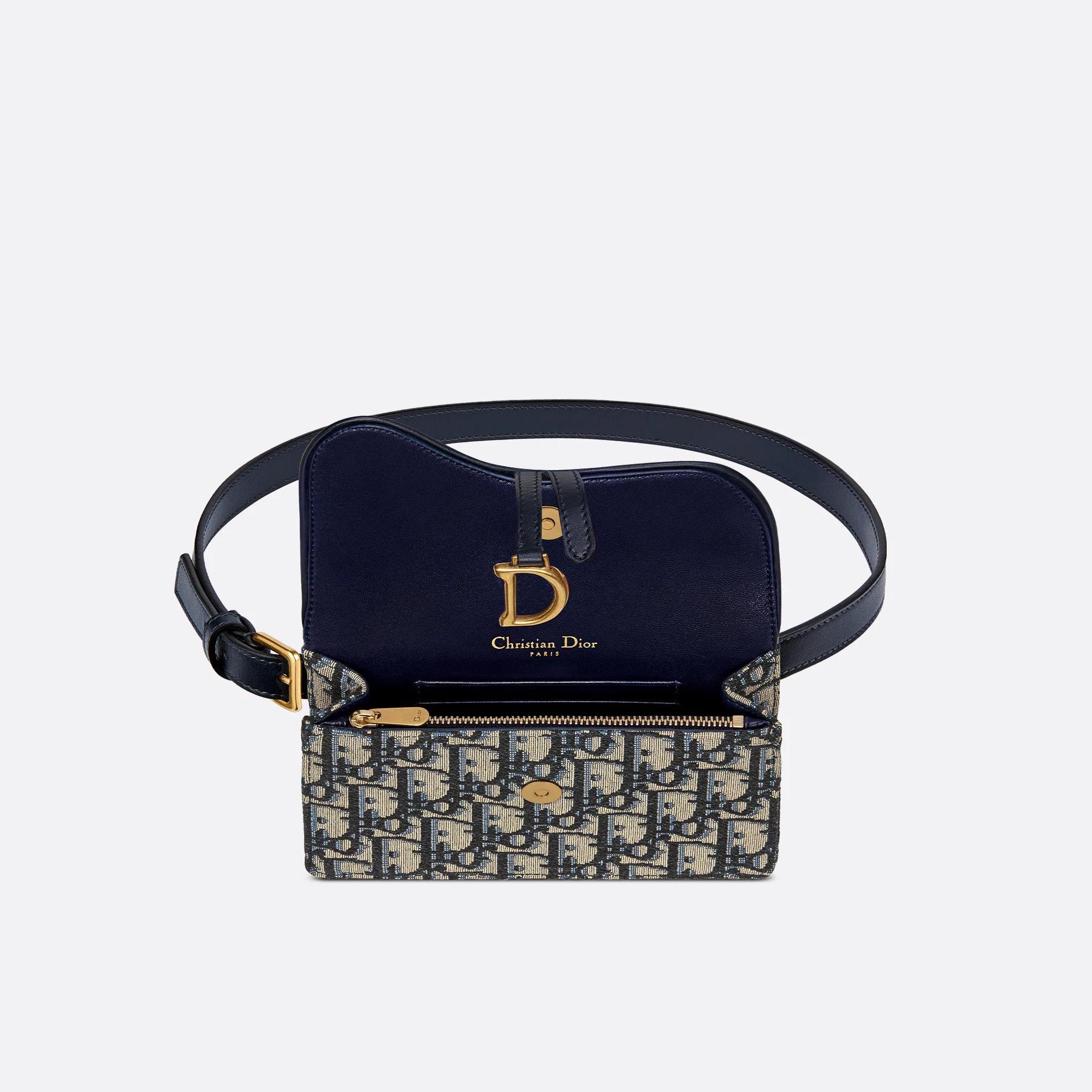 This is an authentic CHRISTIAN DIOR Oblique Pouch in Navy Blue. This shoulder bag is finely crafted of navy blue, on ivory Dior monogram canvas. The bag features an adjustable nylon shoulder strap, dual compartments, and polished dark silver hardware. The top has two zippers that open to a black fabric interior with card slots and patch pockets.