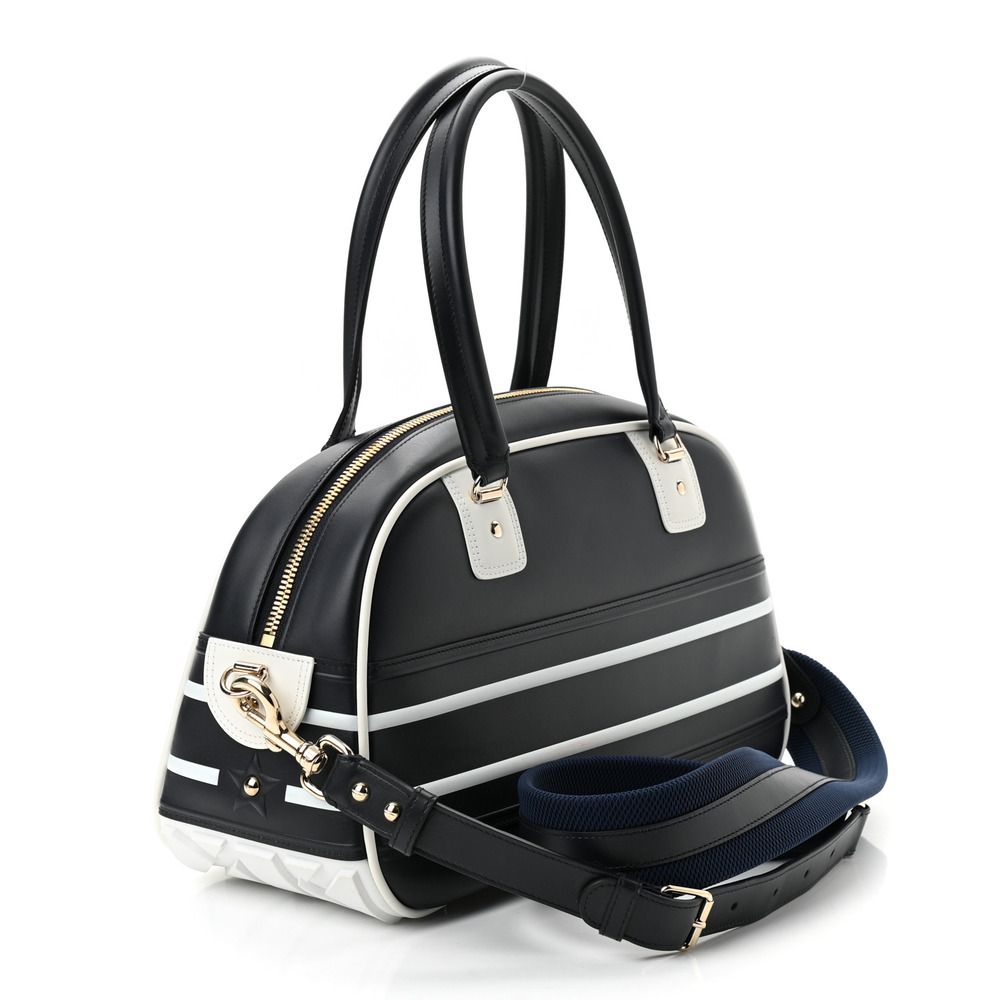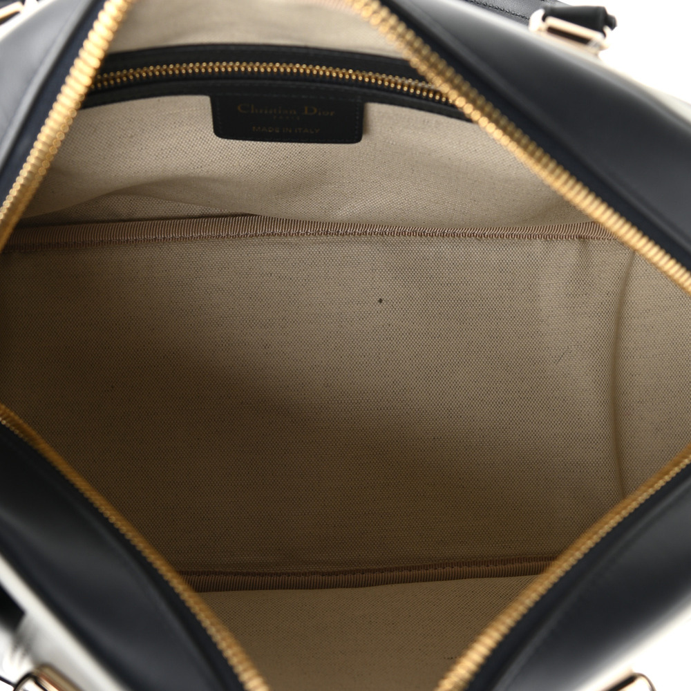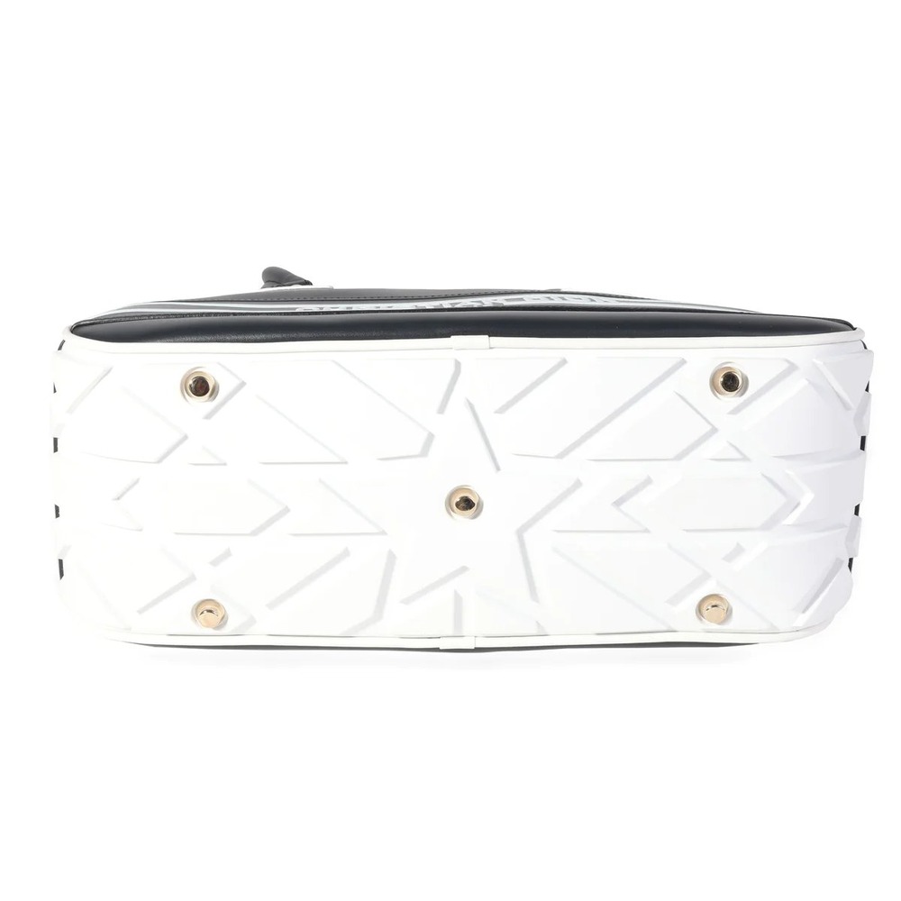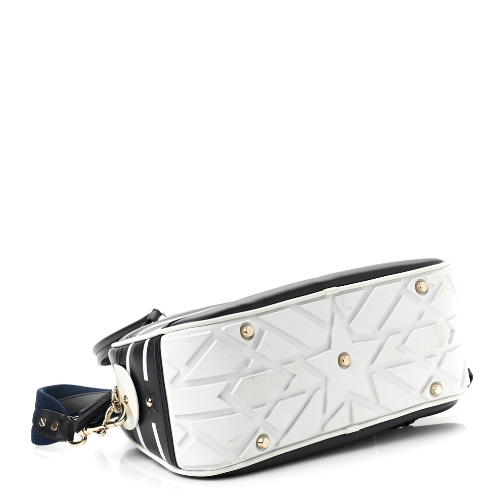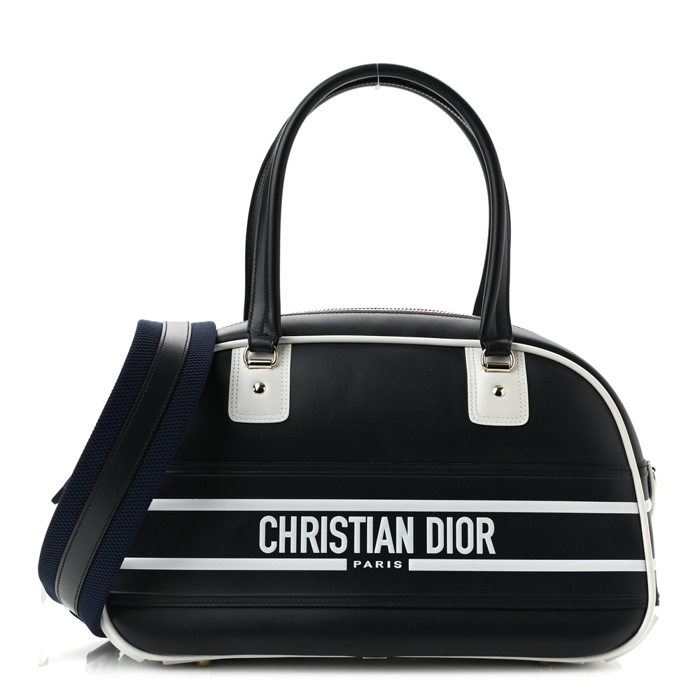 This bowling bag is finely crafted of white calfskin with black leather trim. The bag features white rolled leather handles an optional leather and canvas shoulder strap, gold hardware, exterior zipper pocket, and the CHRISTIAN DIOR logo across the front. The bag opens to a fabric interior with a zipper pocket.