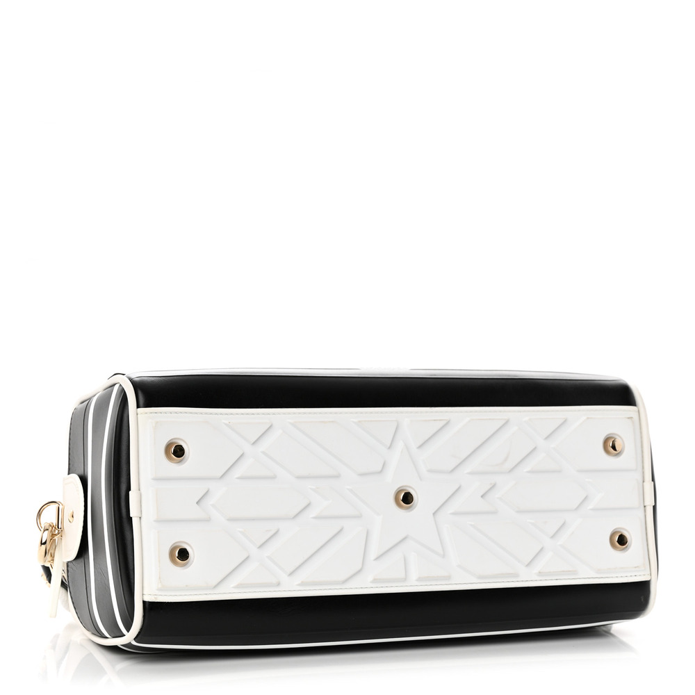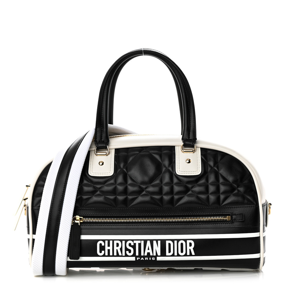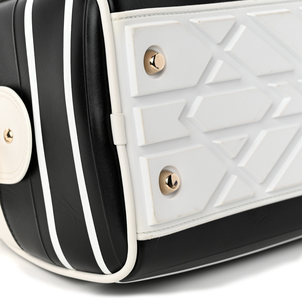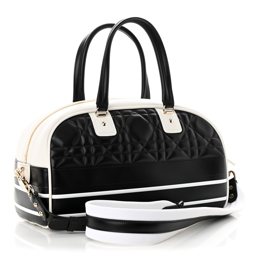 This bowling bag is finely crafted of white calfskin with black leather trim. The bag features white rolled leather handles an optional leather and canvas shoulder strap, gold hardware, exterior zipper pocket, and the CHRISTIAN DIOR logo across the front. The bag opens to a fabric interior with a zipper pocket.