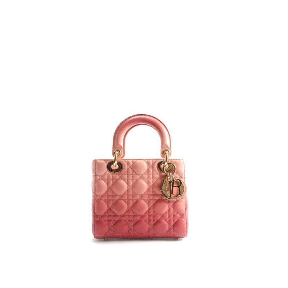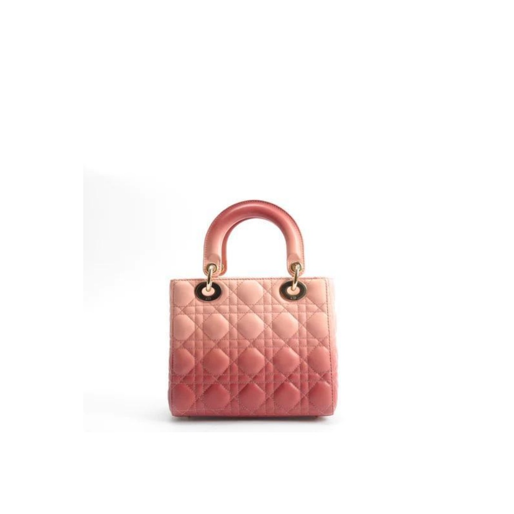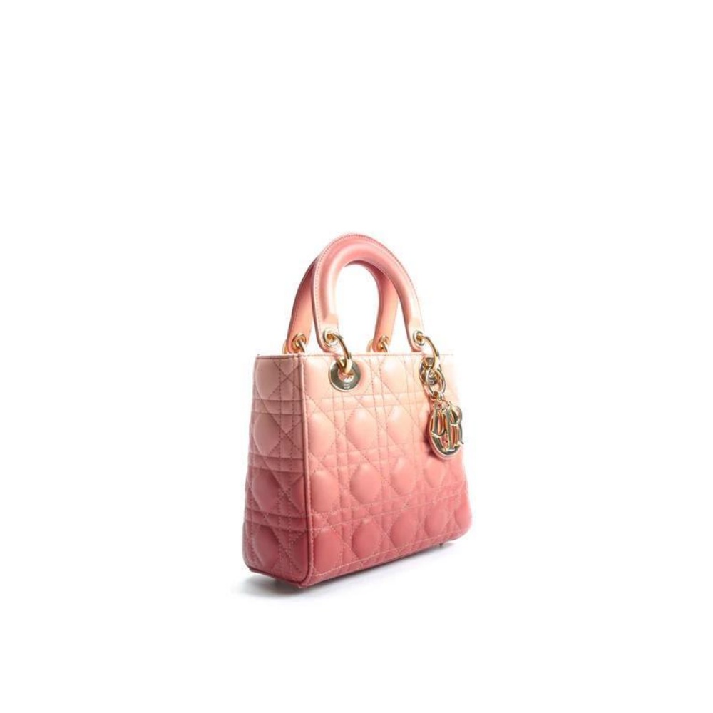 The Lady Dior bag is a medium-sized bag with a rectangular shape. It has a top handle and an adjustable shoulder strap. The bag also includes a removable pouch. The Lady Dior bag is made of high-quality leather and features Cannage stitching and D.I.O.R. charms.