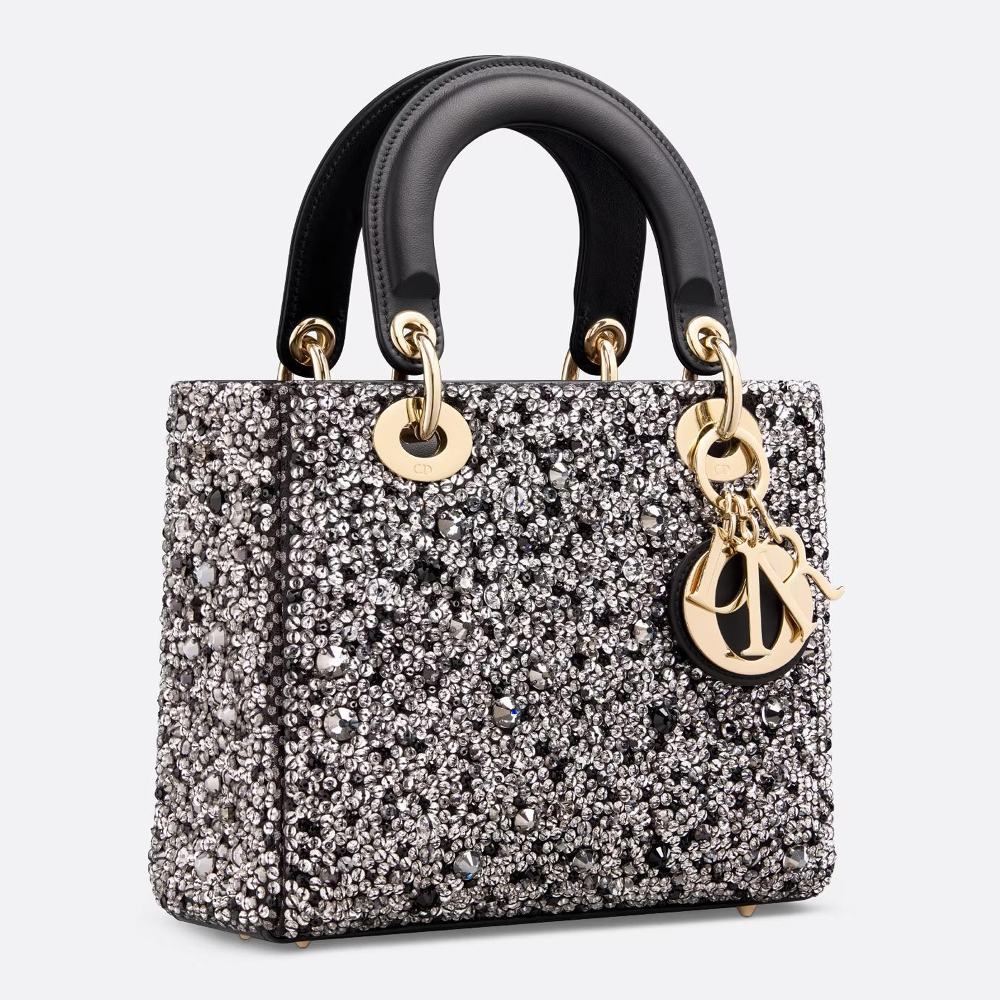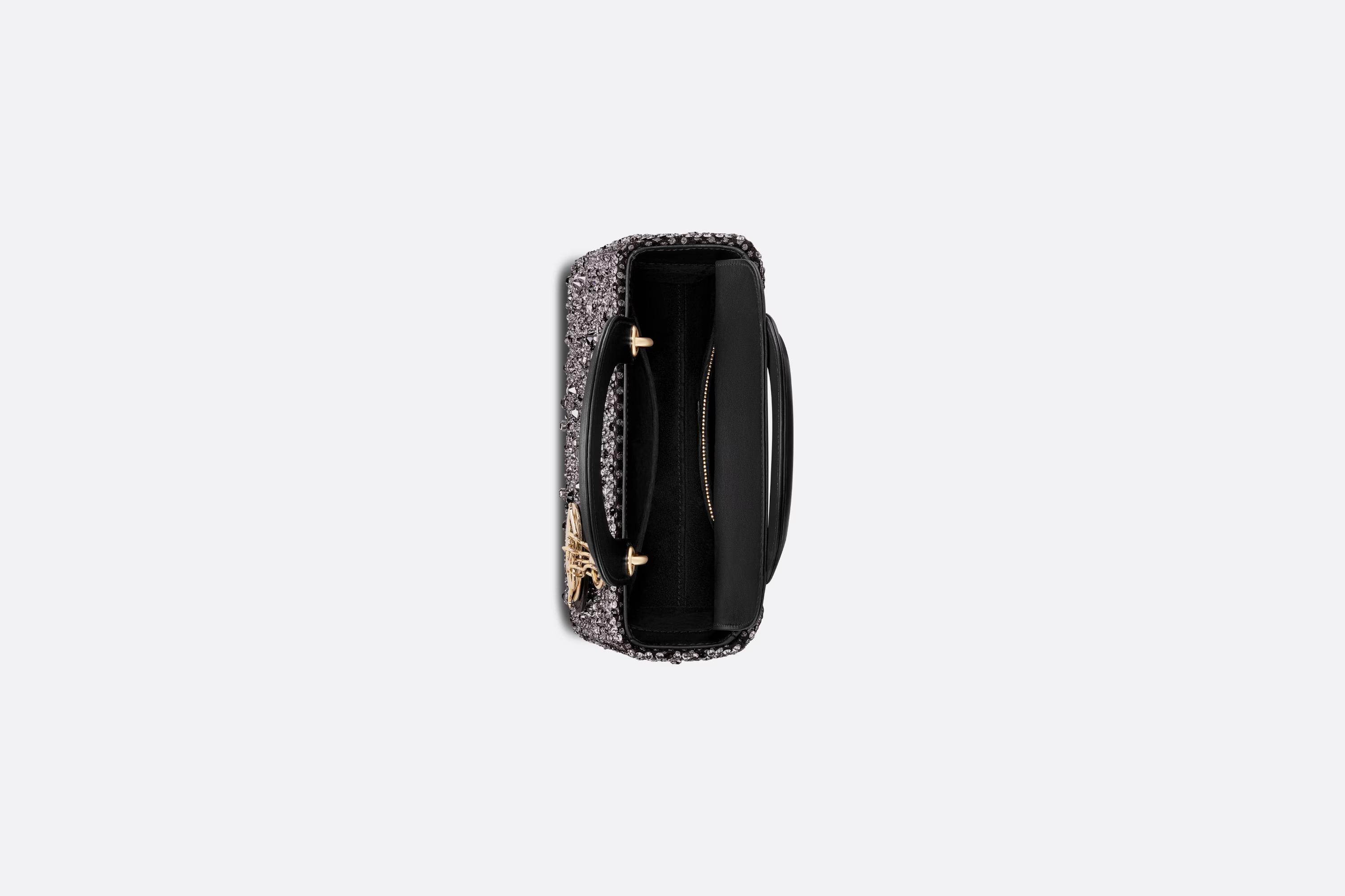 The Lady Dior bag showcases the House’s vision of elegance and beauty. Refined and sleek, the creation is timeless. Crafted in black embroidered satin, the exceptional design is fully covered in strass of varying sizes and tones of silver, offering three-dimensional luminosity. The pale gold-finish metal D.I.O.R. charms enhance and illuminate the silhouette. Featuring a thin, removable leather strap, the small Lady Dior bag can be carried by hand or worn crossbody.