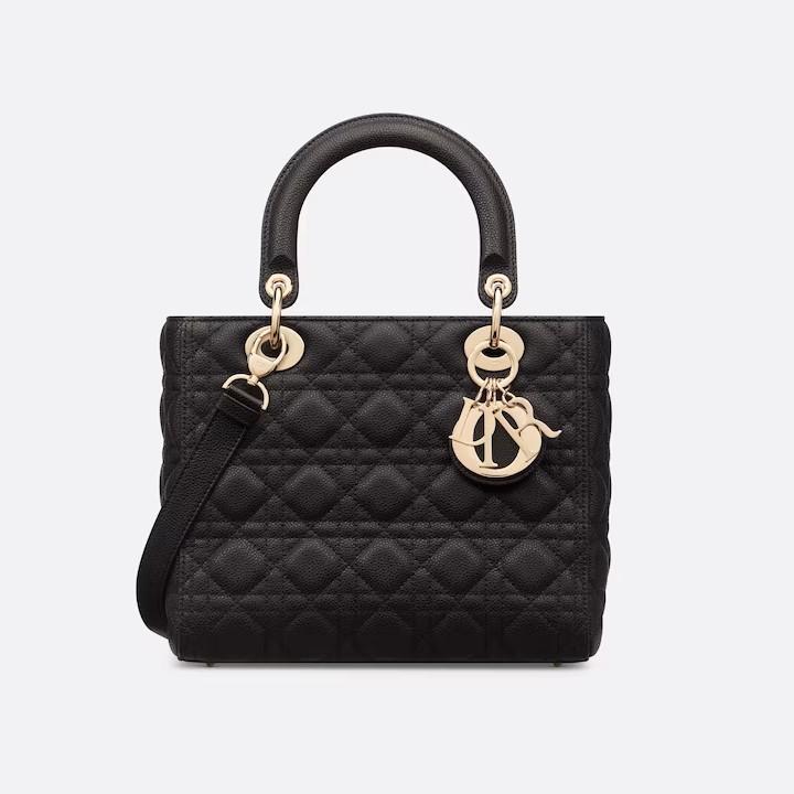 The Lady Dior bag epitomizes the House’s vision of elegance and beauty. Sleek and refined, the timeless creation is crafted in black grained calfskin with Cannage stitching, creating the instantly recognizable quilted texture. The pale gold-finish metal D.I.O.R. charms offer an elegant appeal. Featuring a thin, removable leather shoulder strap, the medium Lady Dior bag can be carried by hand or worn crossbody.