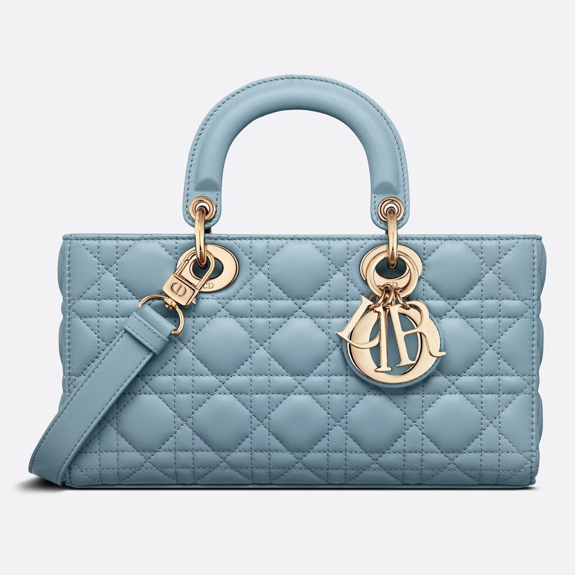 The Lady D-Joy bag captures the House’s vision of elegance and beauty by showcasing the iconic streamlined aesthetic of the Lady Dior line. Crafted in horizon blue lambskin with Cannage stitching, the refined and timeless style is enhanced by pale gold-finish metal D.I.O.R. charms elegantly embellishing its silhouette.