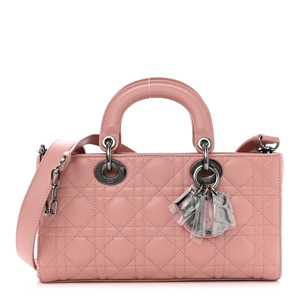 The Lady D-Joy bag captures the House’s vision of elegance and beauty by showcasing the iconic streamlined aesthetic of the Lady Dior line. Crafted in latte Cannage calfskin featuring a Diamond motif, the refined and timeless style is enhanced by tonal matte metal D.I.O.R. charms elegantly embellishing its silhouette. Equipped with one removable chain shoulder strap and another adjustable and removable leather shoulder strap, the medium Lady D-Joy bag can be carried by hand, worn over the shoulder or crossbody as a daily companion.