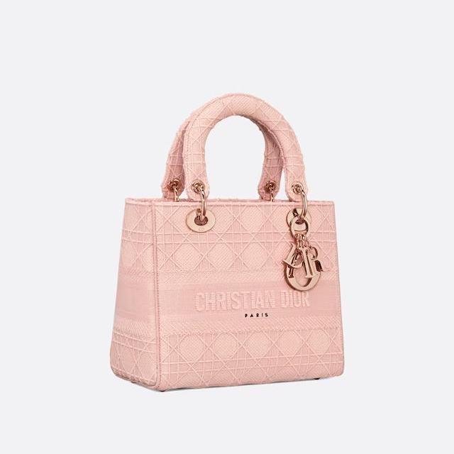The Lady D-Lite bag combines classic elegance with House modernity. The style is fully embroidered with a rosewood Cannage motif. The front features a Christian Dior signature while the thick D.I.O.R. charms in rose gold-finish metal further enhance the silhouette.Equipped with a wide, reversible and removable embroidered shoulder strap, the medium Lady D-Lite bag can be carried by hand or worn crossbody.