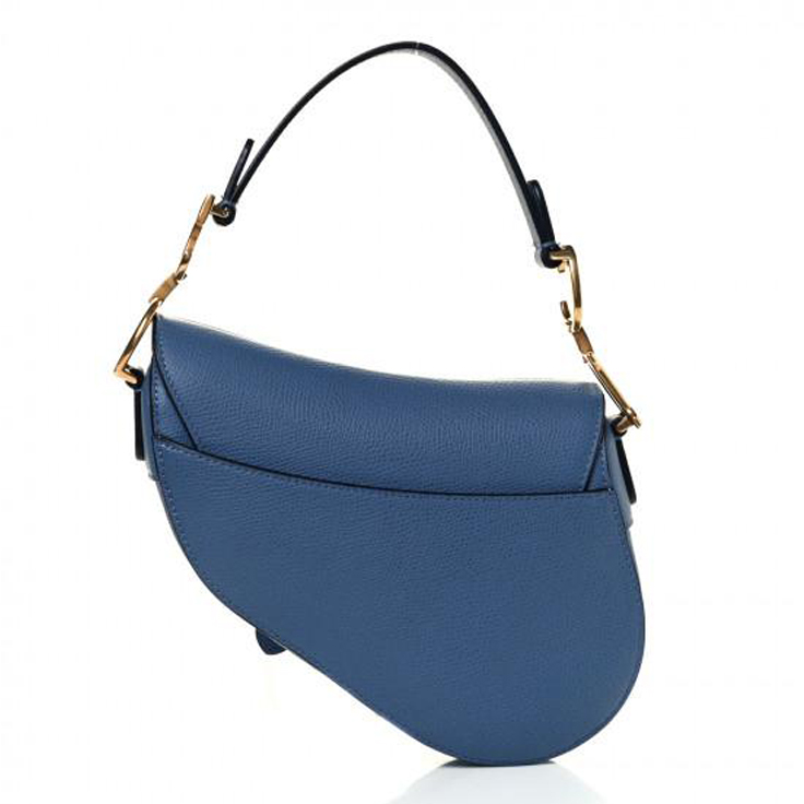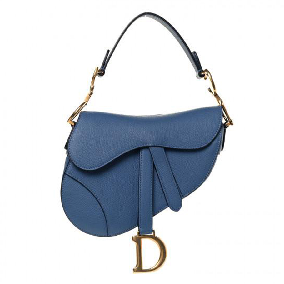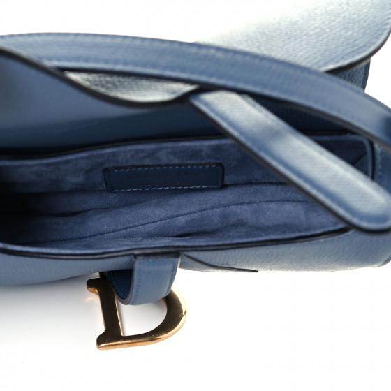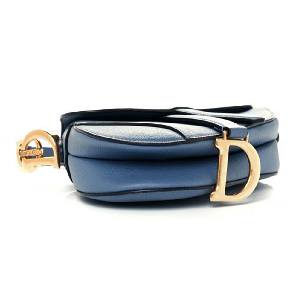 Grained Calfskin Mini Saddle Bag in Denim Blue. This saddle-shaped handbag is crafted of grained calfskin leather in sky blue and features a matching leather strap, secured with aged gold CD logo anchors. The front flap has an aged gold D initial logo and opens to a matching blue microfiber interior.