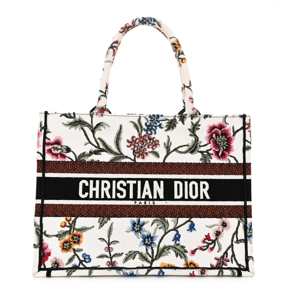 Introduced by Maria Grazia Chiuri, Creative Director of Christian Dior, the Dior Book Tote has become a staple of the Dior aesthetic. Designed to hold all the daily essentials, it is fully embroidered with a white and pastel pink Butterfly Around The World motif, showcasing the collection’s signature butterfly embellished with the words L’envol des papillons d??voile nos d??sirs aux ??toiles. Adorned with the Christian Dior Paris signature on the front, the large tote exemplifies the House’s signature savoir-faire and may be carried by hand or worn over the shoulder.