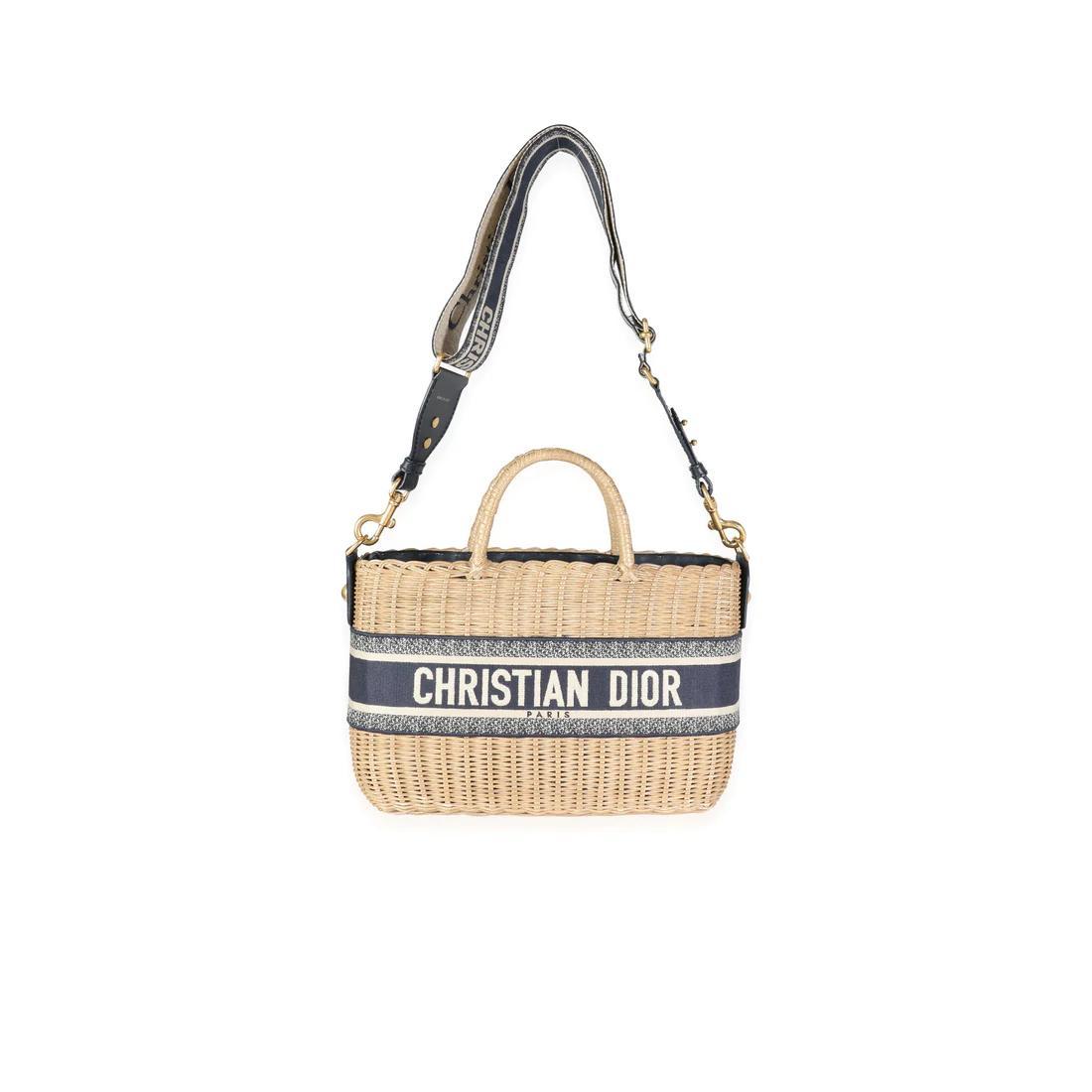 This is an authentic Christian Dior??Oblique Wicker jacquard Basket bag in Beige and Navy. This stylish??basket bag is decorated with the maison’s jacquard logo motif in navy blue and ecru tones. The piece features a detachable shoulder strap for added styling options.??