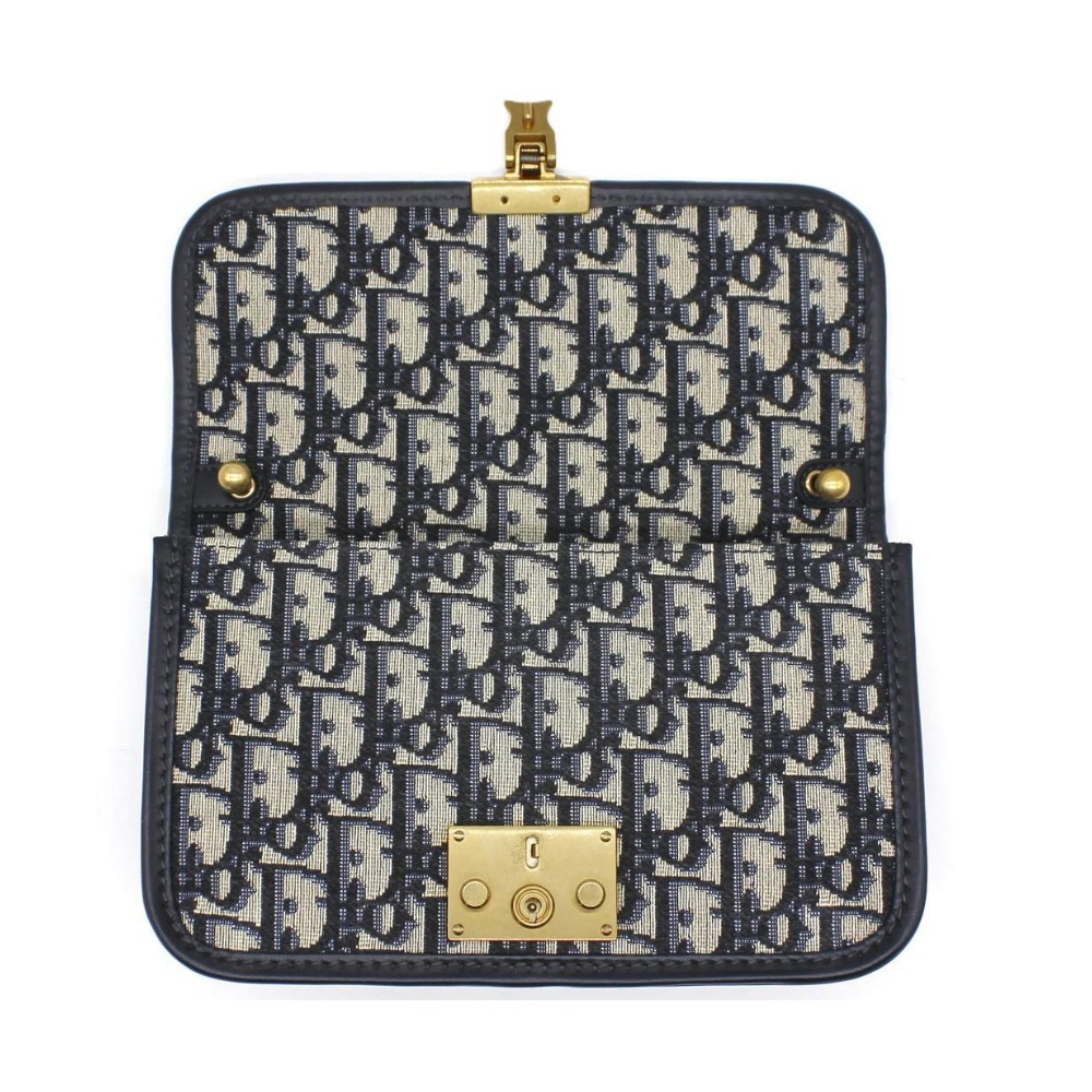 This Dioraddict cloth crossbody bag is made of blue canvas with a black leather trim. It has a single top handle and a detachable shoulder strap. The bag has a main compartment with a zip closure and an interior pocket. It also has a front slip pocket.