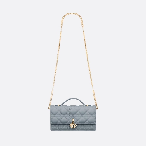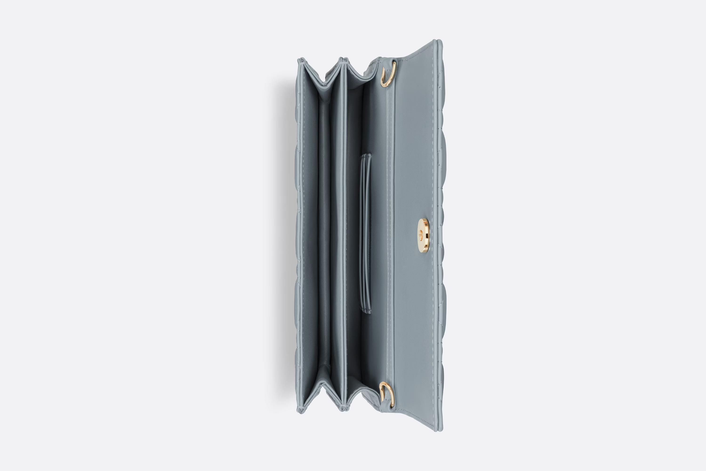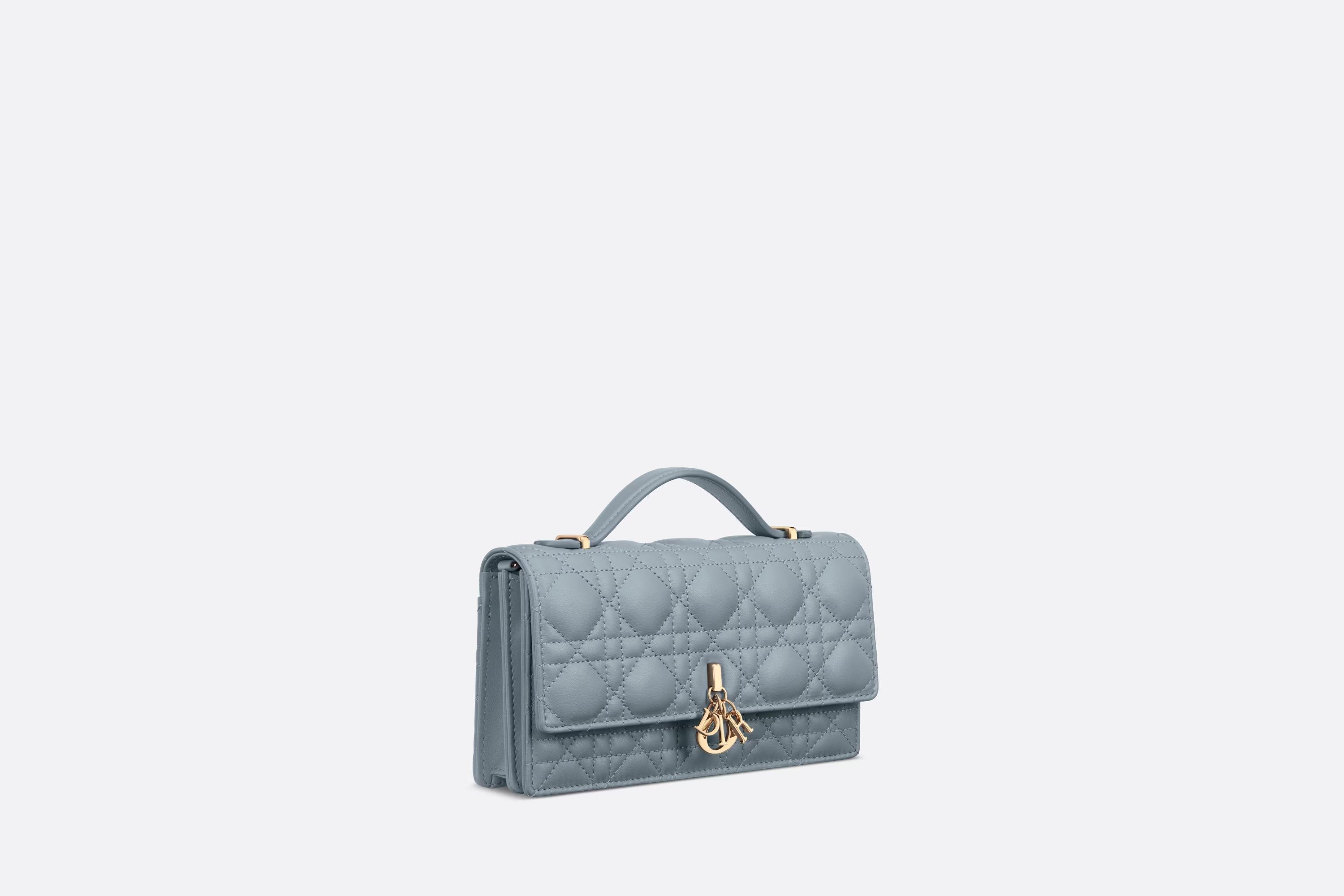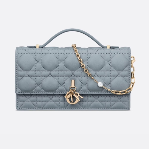 The Miss Dior mini bag elevates the line with an elegant and functional design. Crafted in cloud blue Cannage lambskin, it features a flap enhanced by a D.I.O.R. charm on the front. Equipped with compartments and card slots, the functional accessory holds all the essentials and is the ideal day and evening companion.