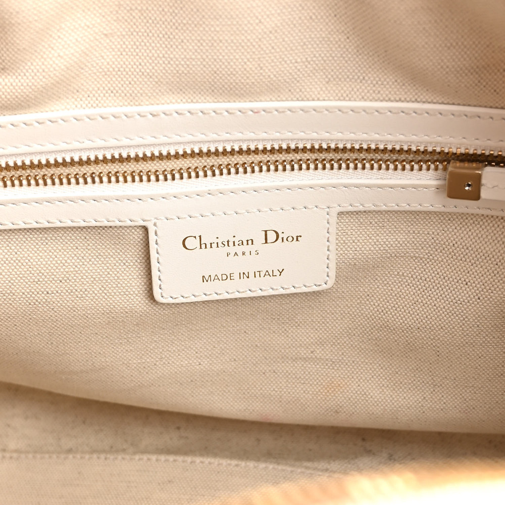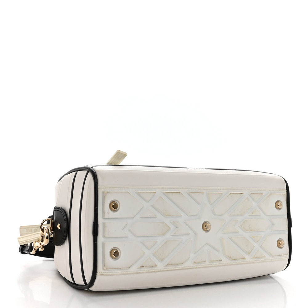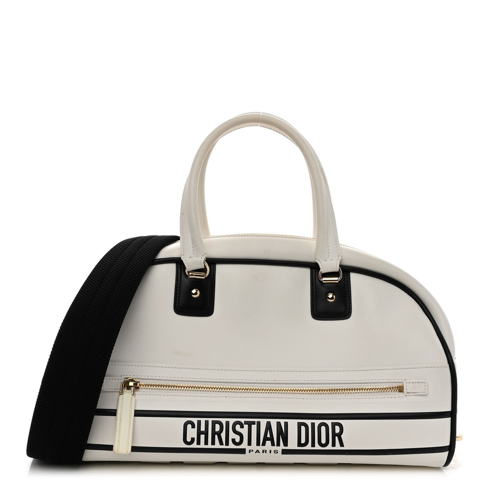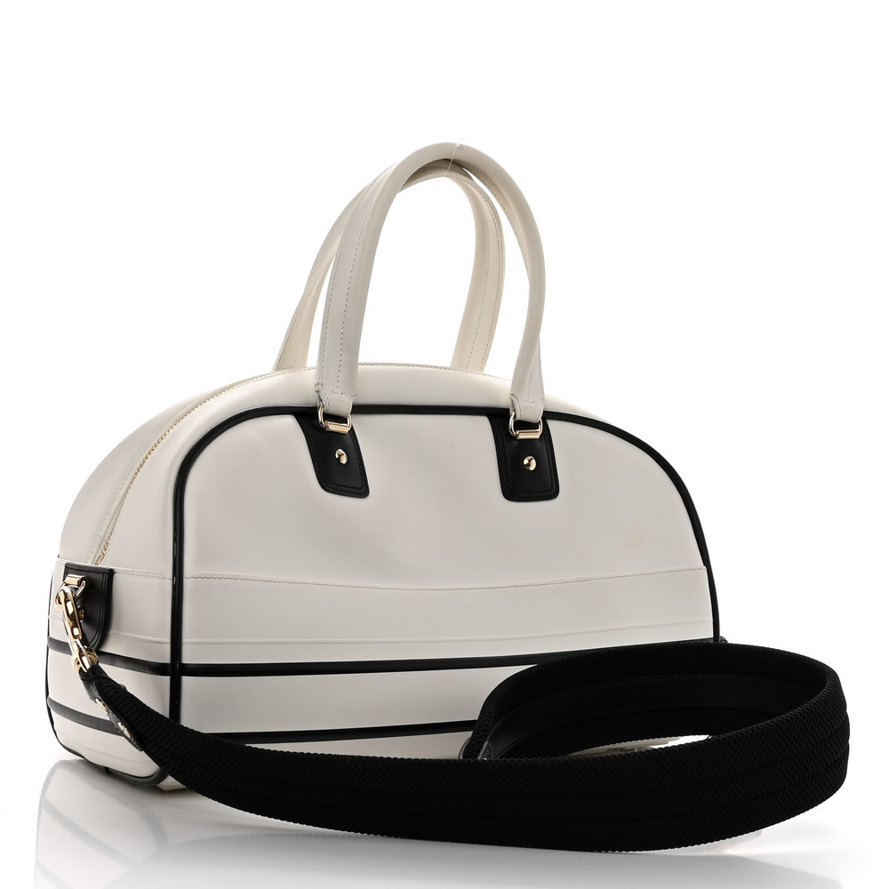 This bowling bag is finely crafted of white calfskin with black leather trim. The bag features white rolled leather handles an optional leather and canvas shoulder strap, gold hardware, exterior zipper pocket, and the CHRISTIAN DIOR logo across the front. The bag opens to a fabric interior with a zipper pocket.