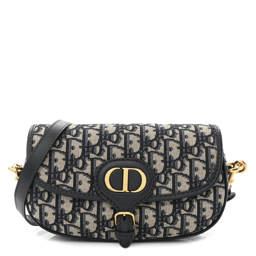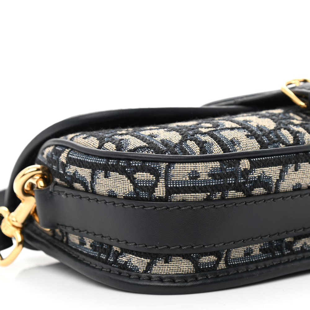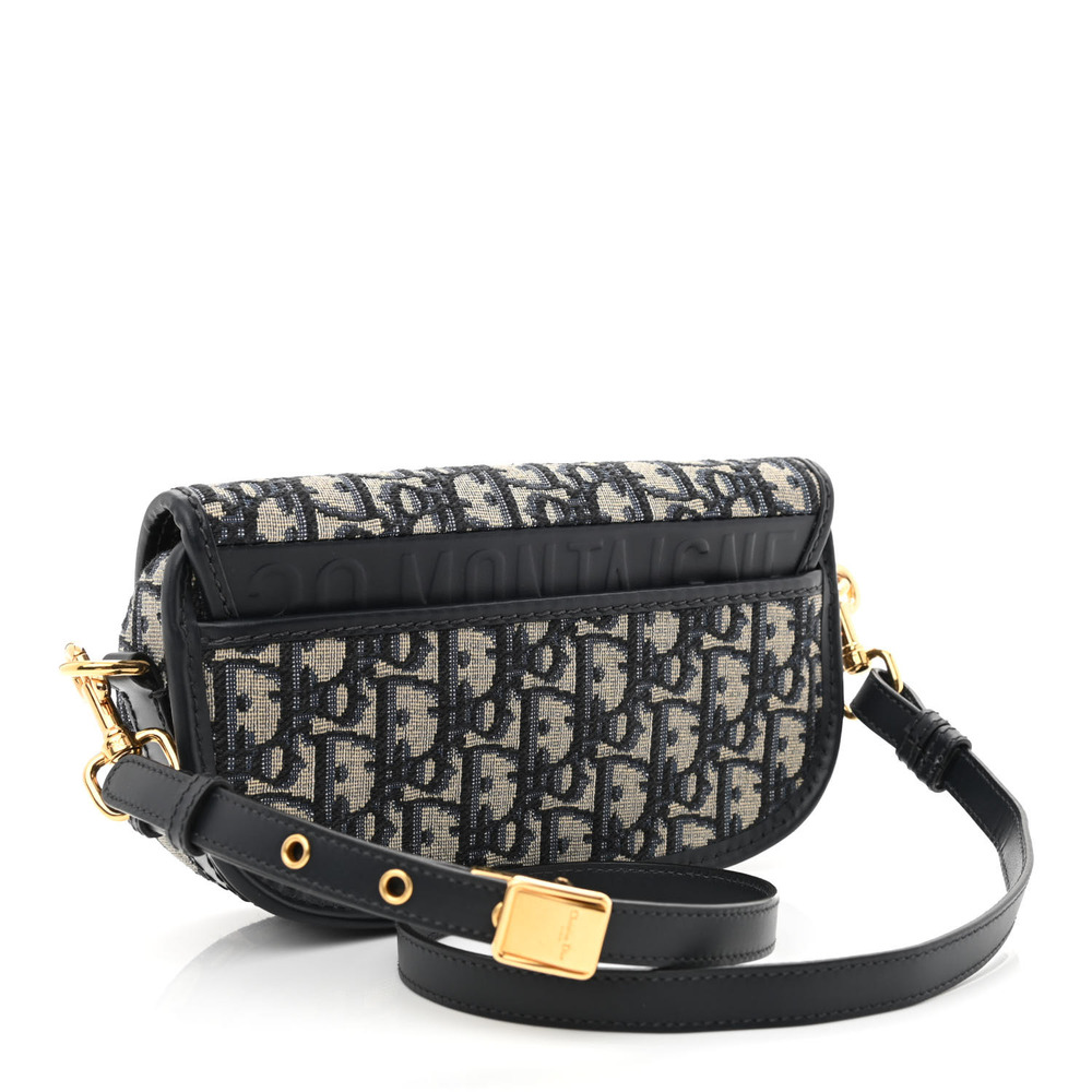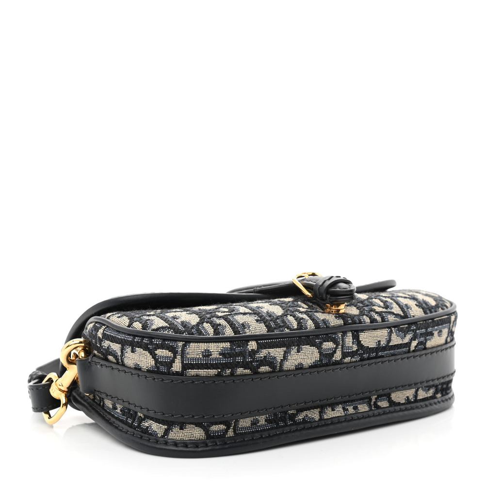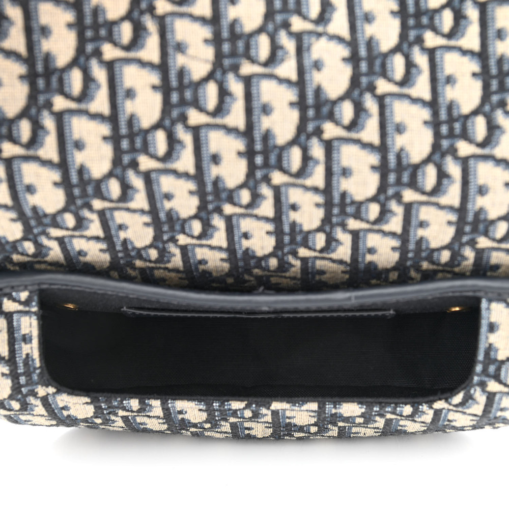 This flap bag is finely crafted of Christian Dior Oblique monogram print canvas, with dark blue leather trim. The bag features a magnetic clasp and polished gold hardware. The flap opens to a canvas interior with a leather patch pocket.