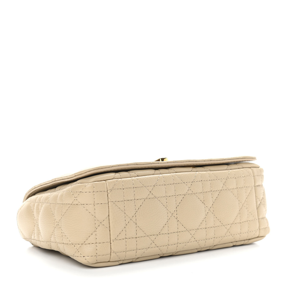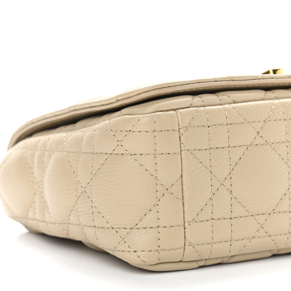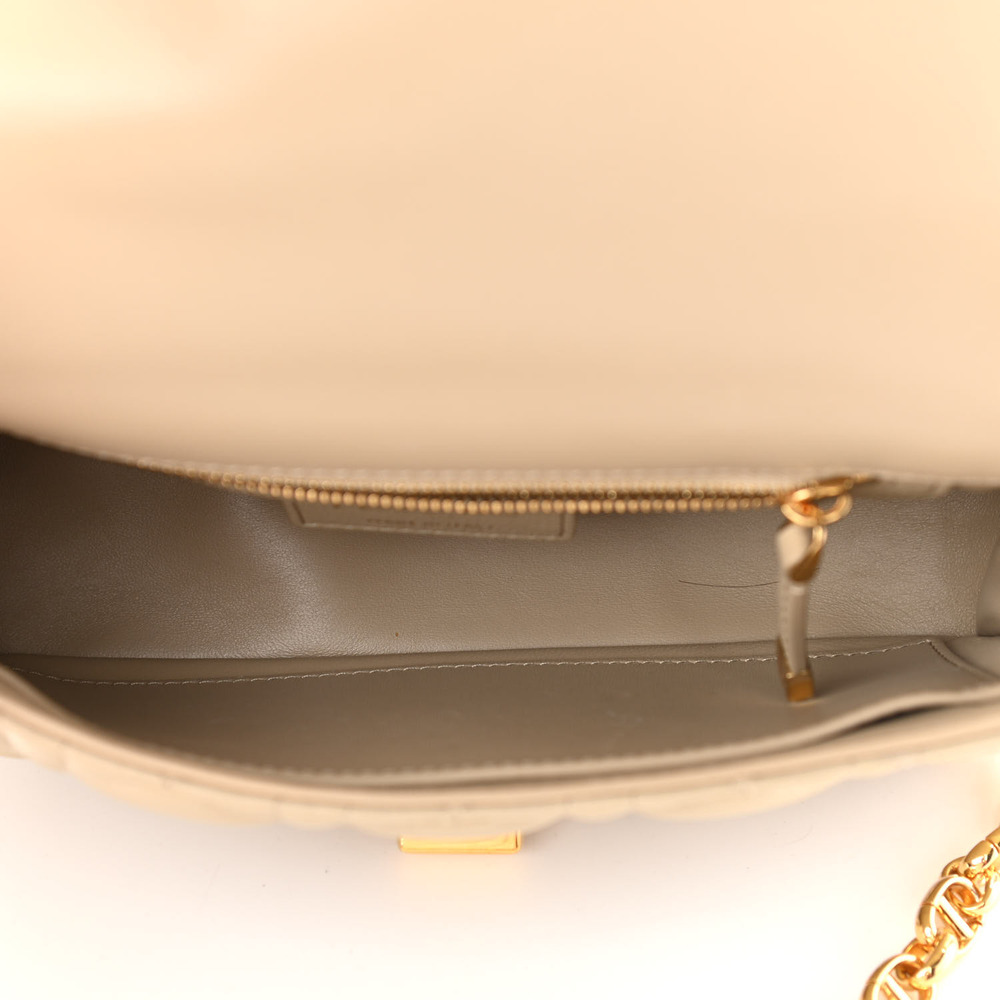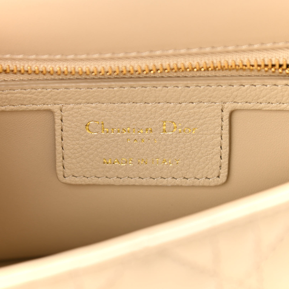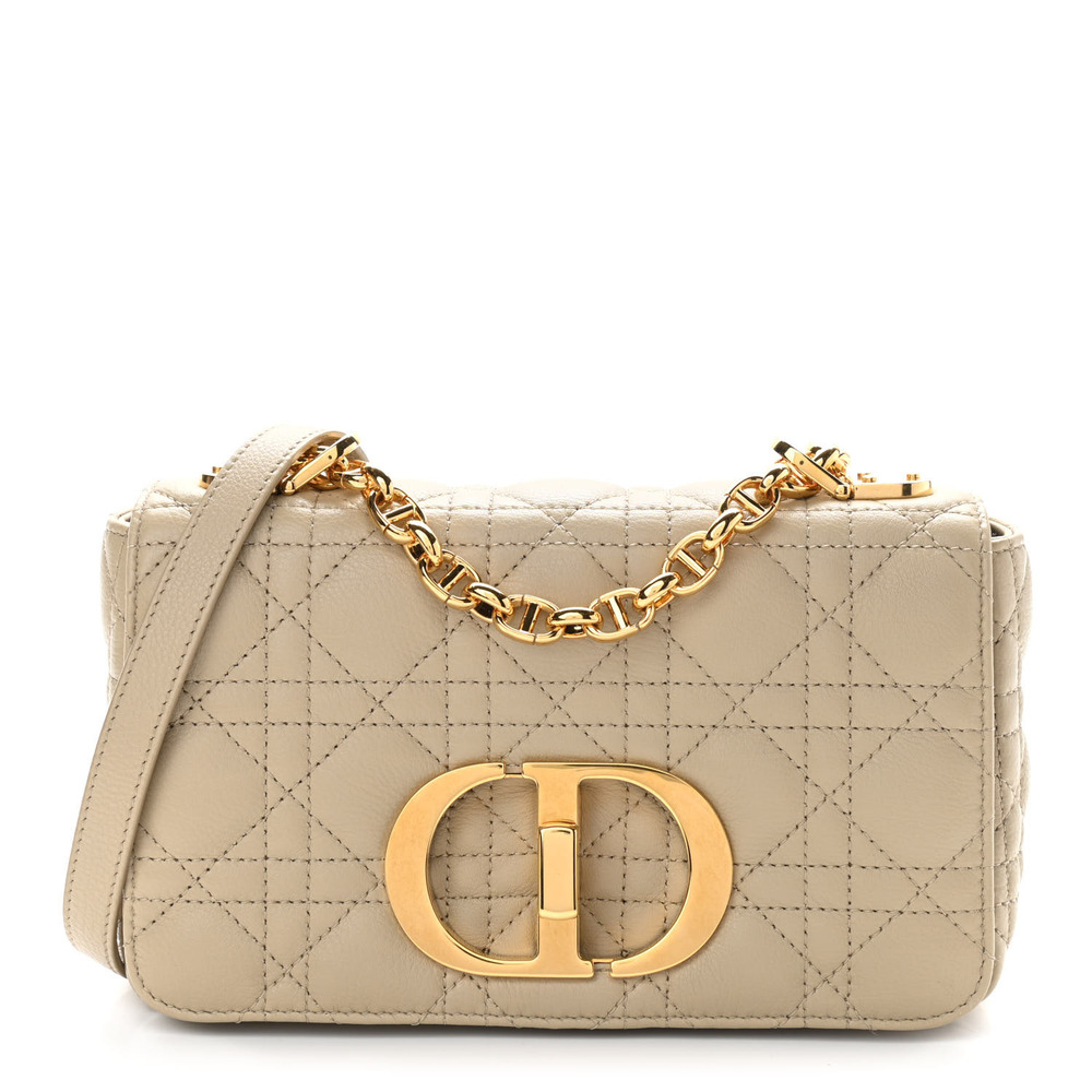 The Dior Caro bag combines modernity with timeless elegance. The style is crafted in black supple calfskin with Cannage stitching. The bag showcases a flap adorned with an antique gold-finish metal CD twist clasp, inspired by the seal of a Christian Dior perfume bottle. The detachable chain shoulder strap with CD signature links allows the small bag to be carried by hand, worn over the shoulder or crossbody, and may be replaced by one of the House’s wide embroidered straps for day or evening attire.
