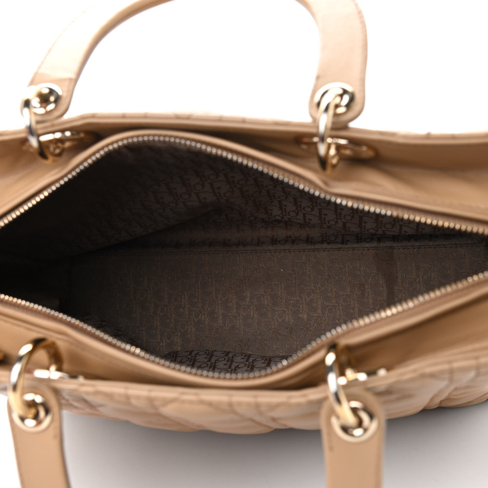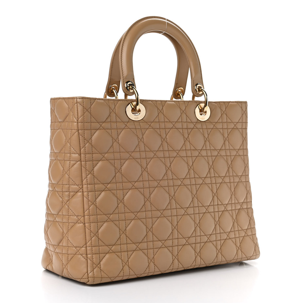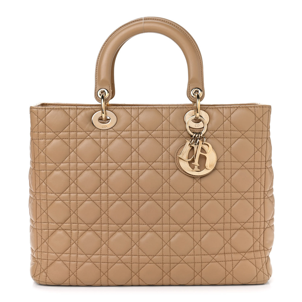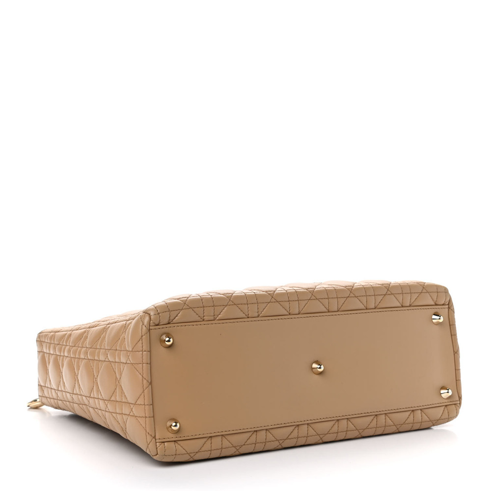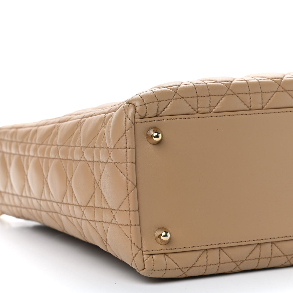The Lady Dior bag embodies Dior’s vision of elegance and beauty. Refined and sleek, the timeless style is crafted in sand pink lambskin with Cannage stitching, creating the instantly recognizable quilted texture. Pale gold-finish metal D.I.O.R. charms offer elegant appeal. Featuring a removable thin leather shoulder strap, the large Lady Dior bag can be carried by hand or worn crossbody.