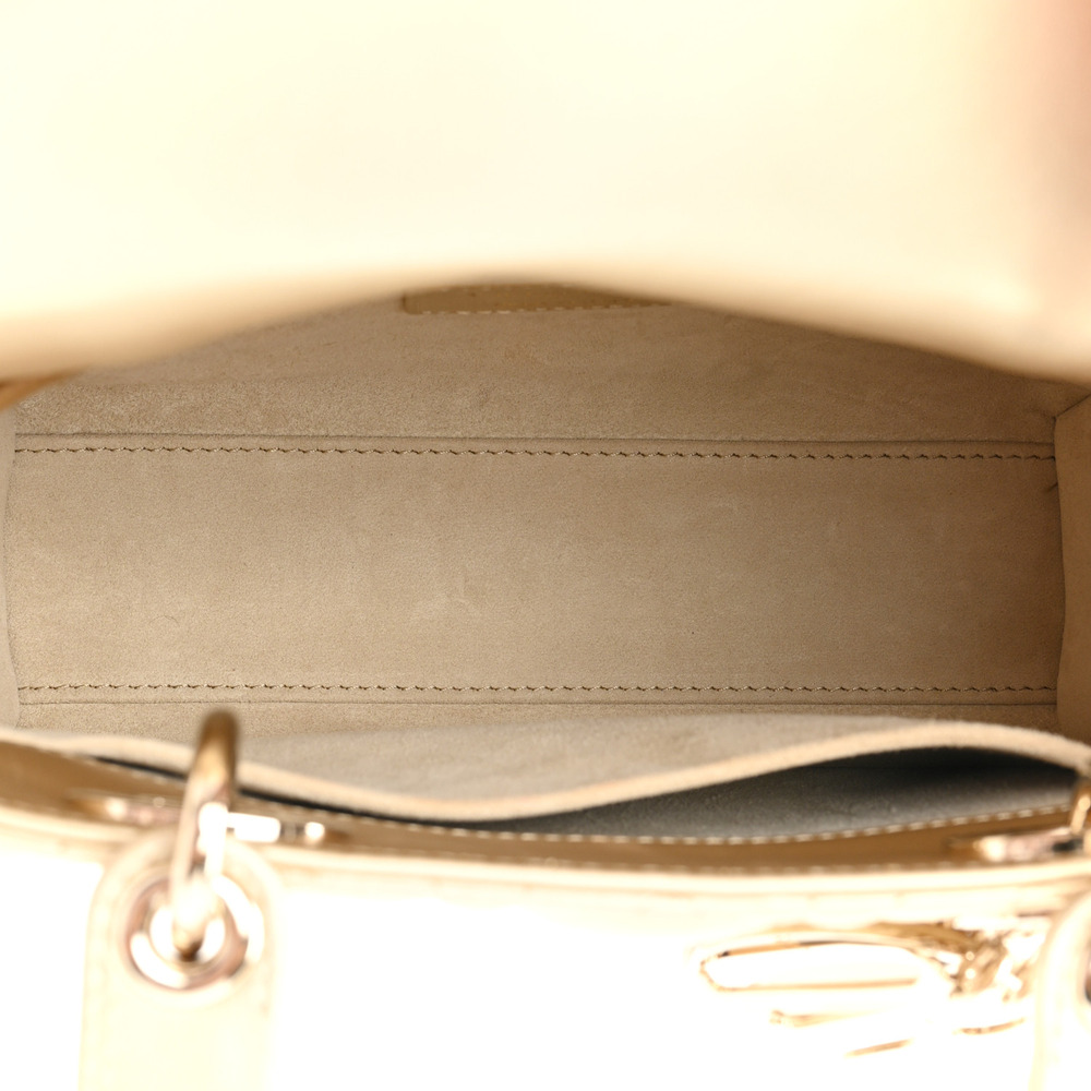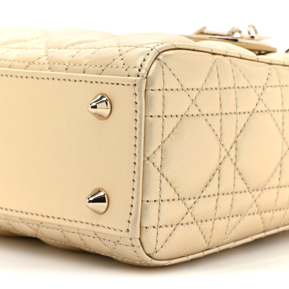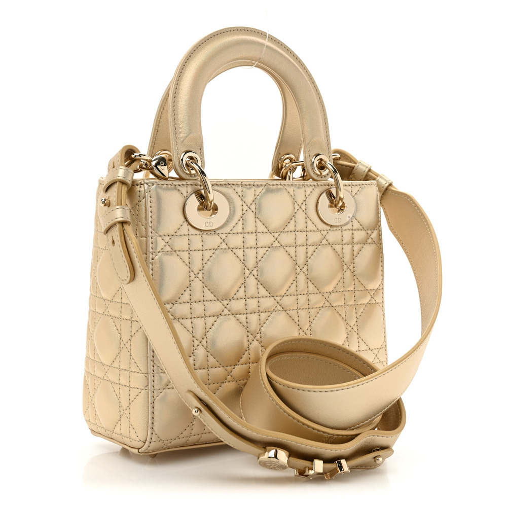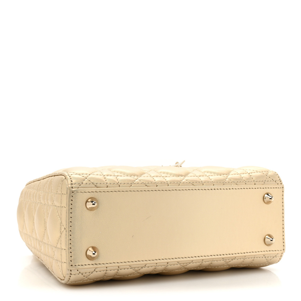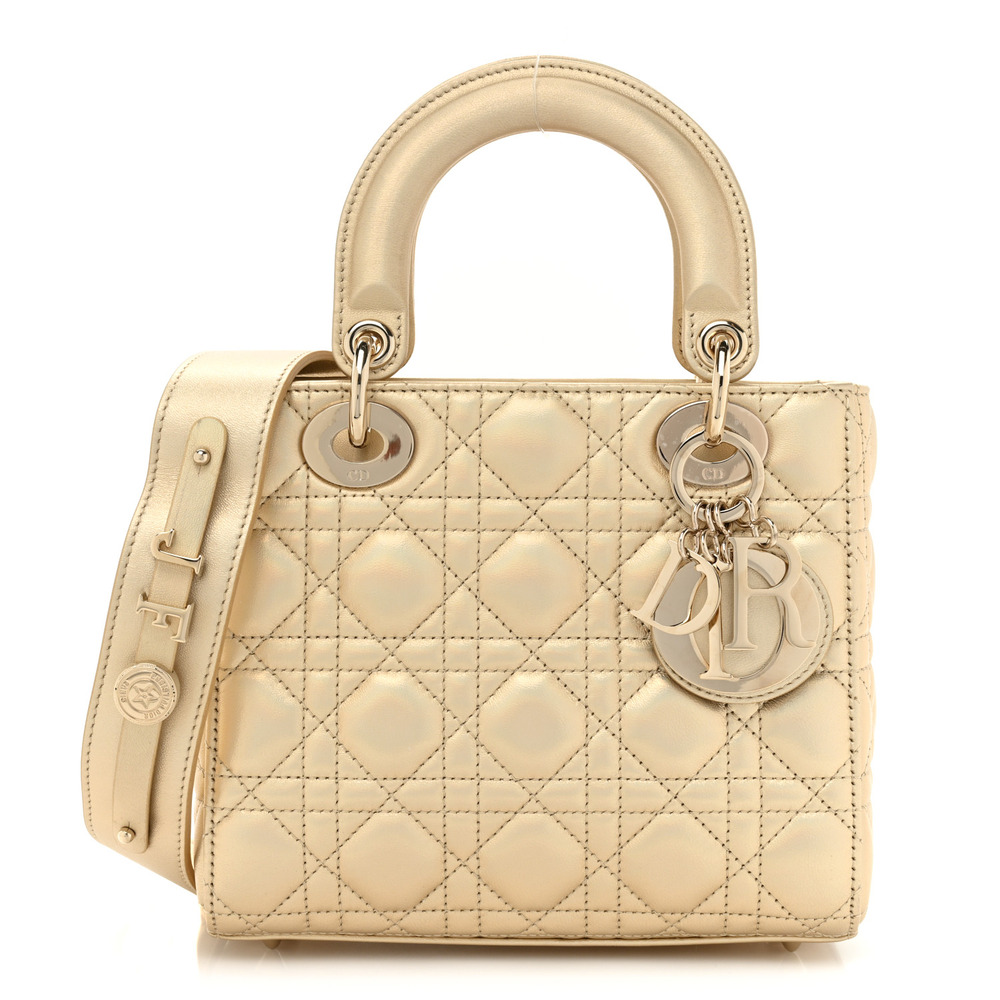 The Lady Dior bag epitomizes the House’s vision of elegance and beauty. Sleek and refined, the timeless creation is crafted in black lambskin with Cannage stitching, creating the instantly recognizable quilted texture. The pale gold-finish metal D.I.O.R. charms offer an elegant allure. Featuring a thin, removable leather shoulder strap, the medium Lady Dior bag can be carried by hand or worn crossbody.
