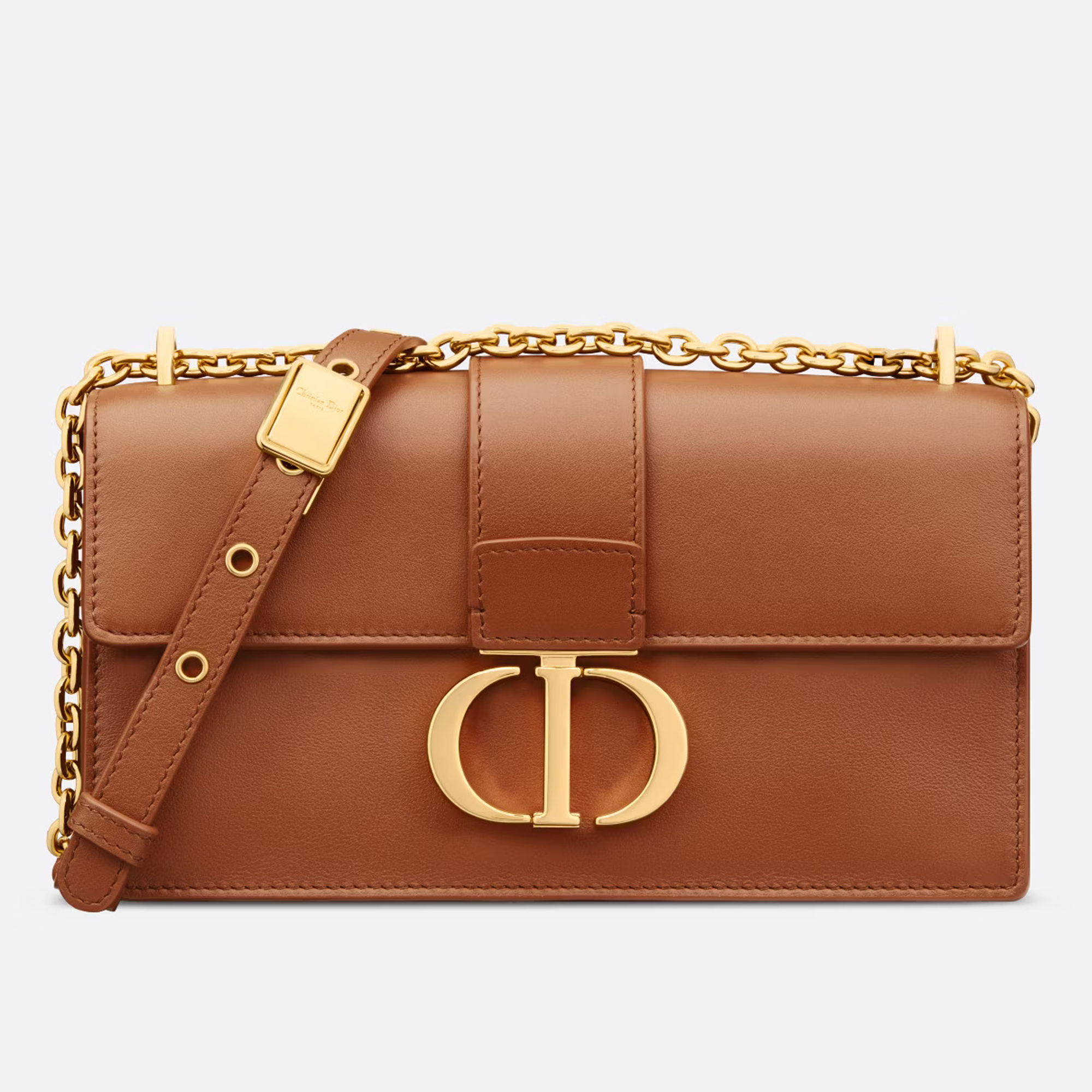 Crafted in golden saddle ultra-smooth calfskin, the East-West bag with chain features an antique gold-finish metal CD clasp and removable chain strap