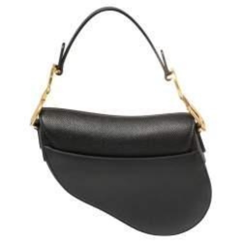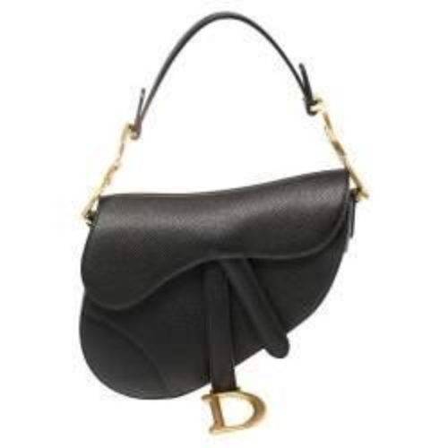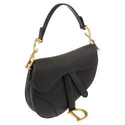 Grained Calfskin Mini Saddle Bag in Black. This bag features the saddle bag shape, short leather shoulder strap with a polished brass “C” and “D” anchors on either end of the handle for handle and a prominent hanging Dior “D” charm. The opens to a microfiber interior.