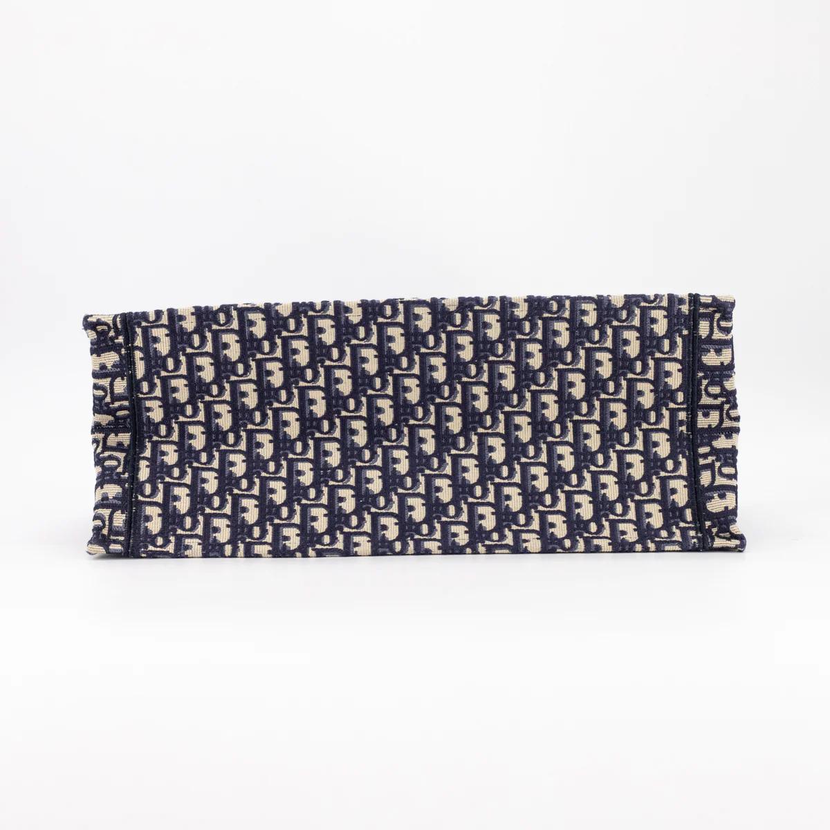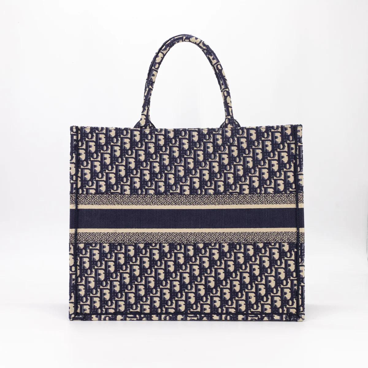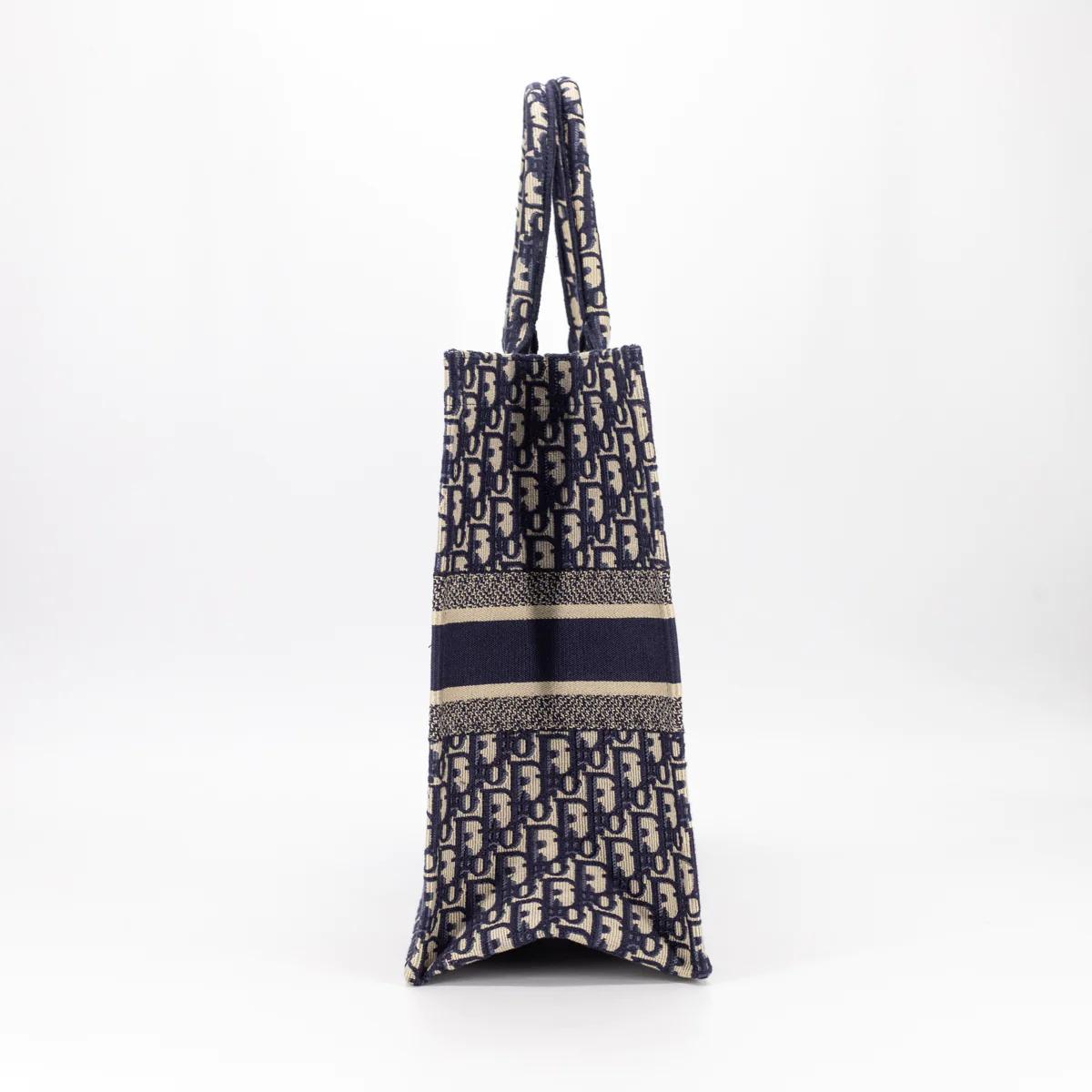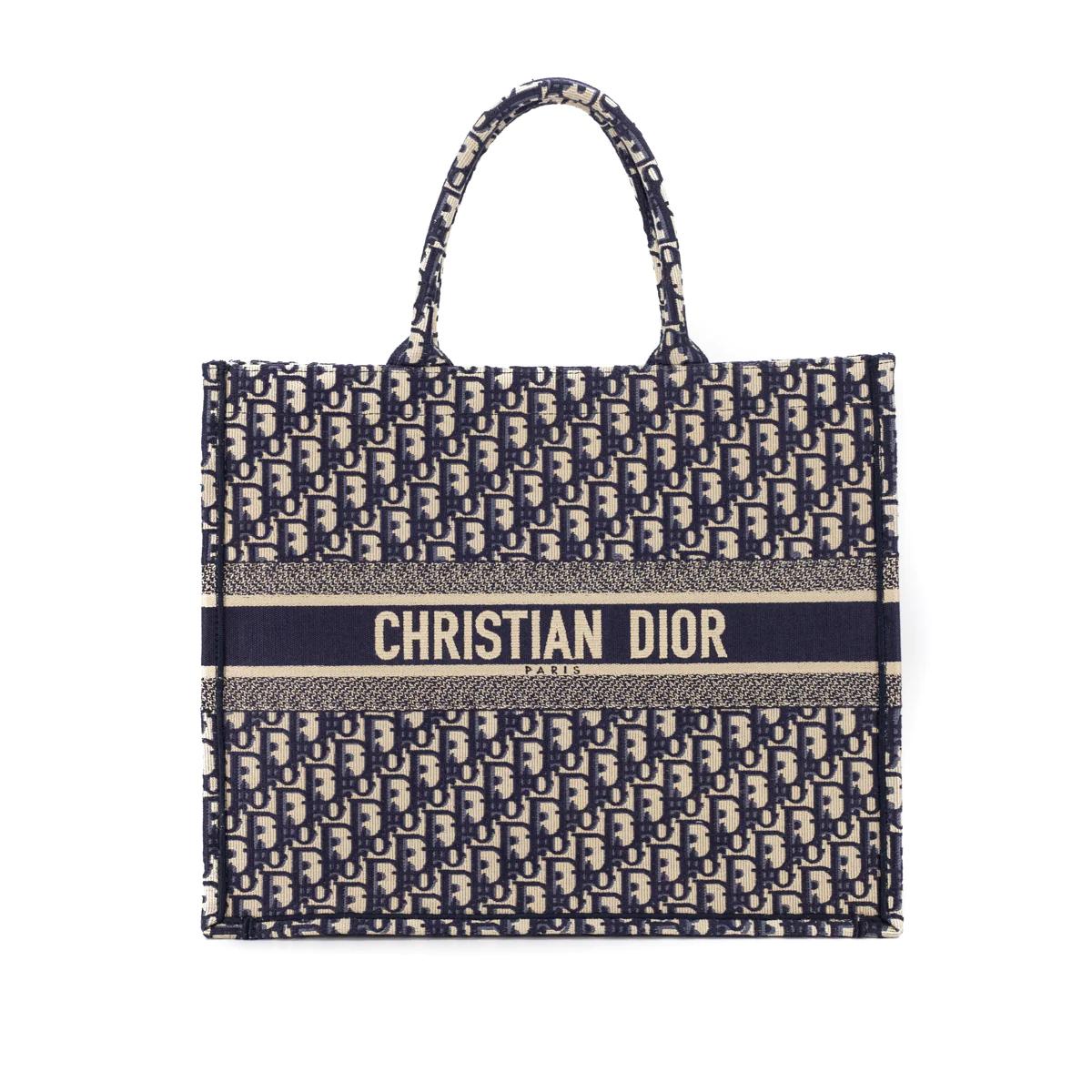 It is a navy blue canvas tote bag with a black leather trim. The bag has a large, rectangular shape with two top handles. The front of the bag features the Christian Dior logo in large, white letters.