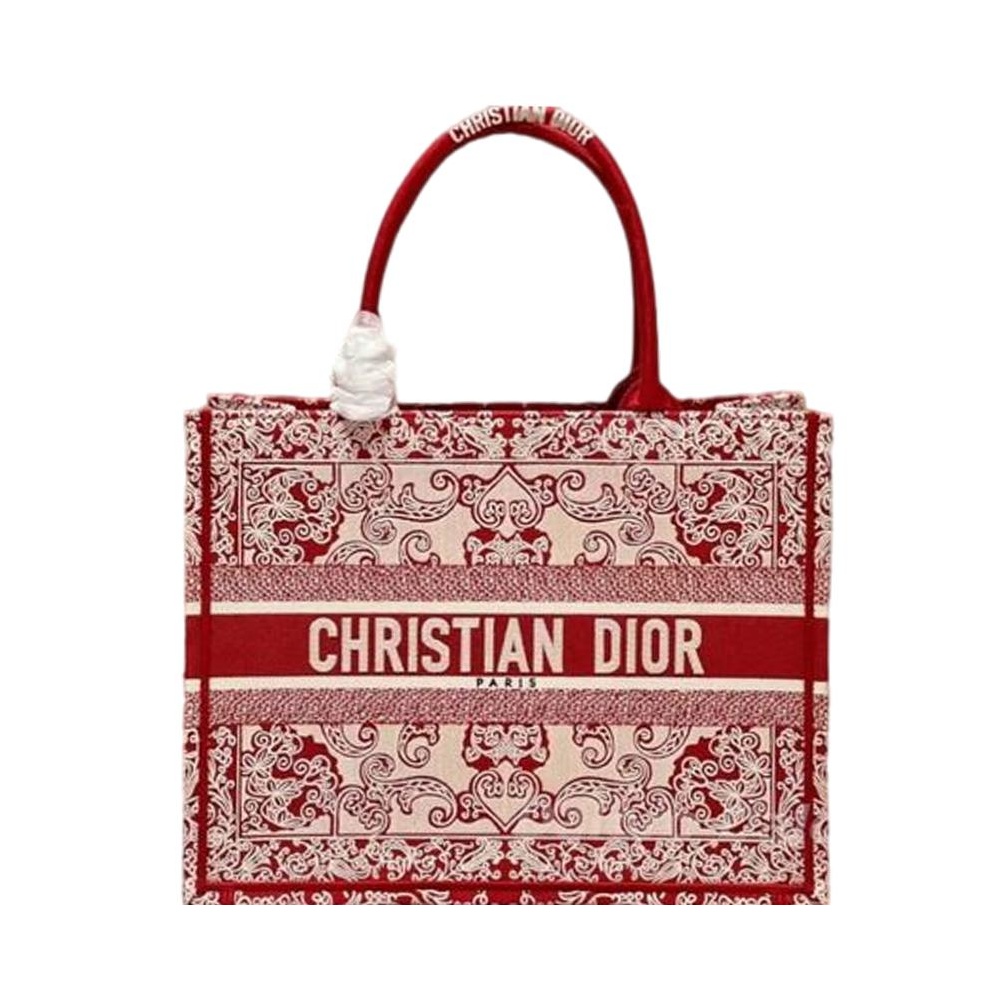 It is a red and white canvas tote bag with a black leather trim. The bag has a large, rectangular shape with two top handles. The front of the bag features the Christian Dior logo in large, white letters.