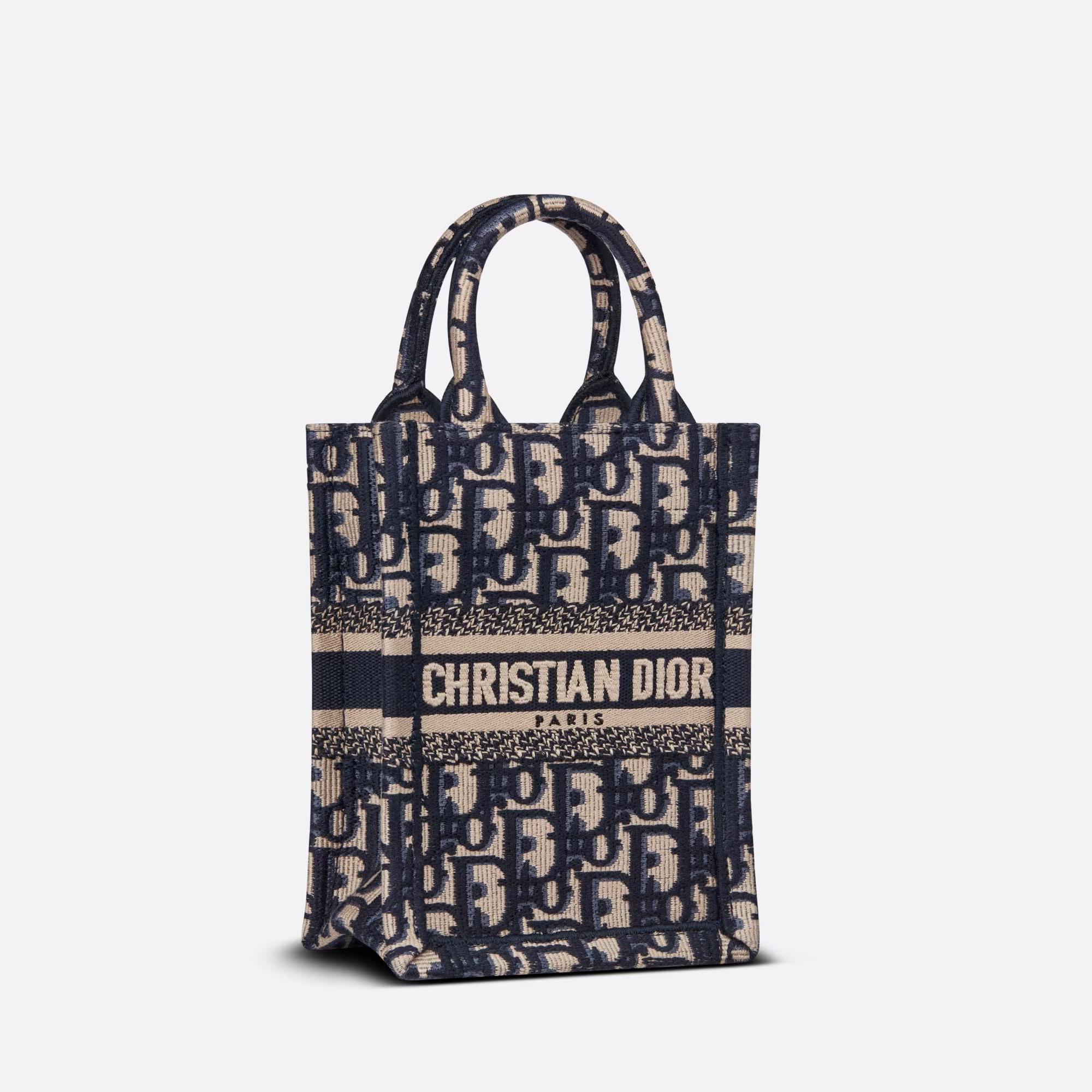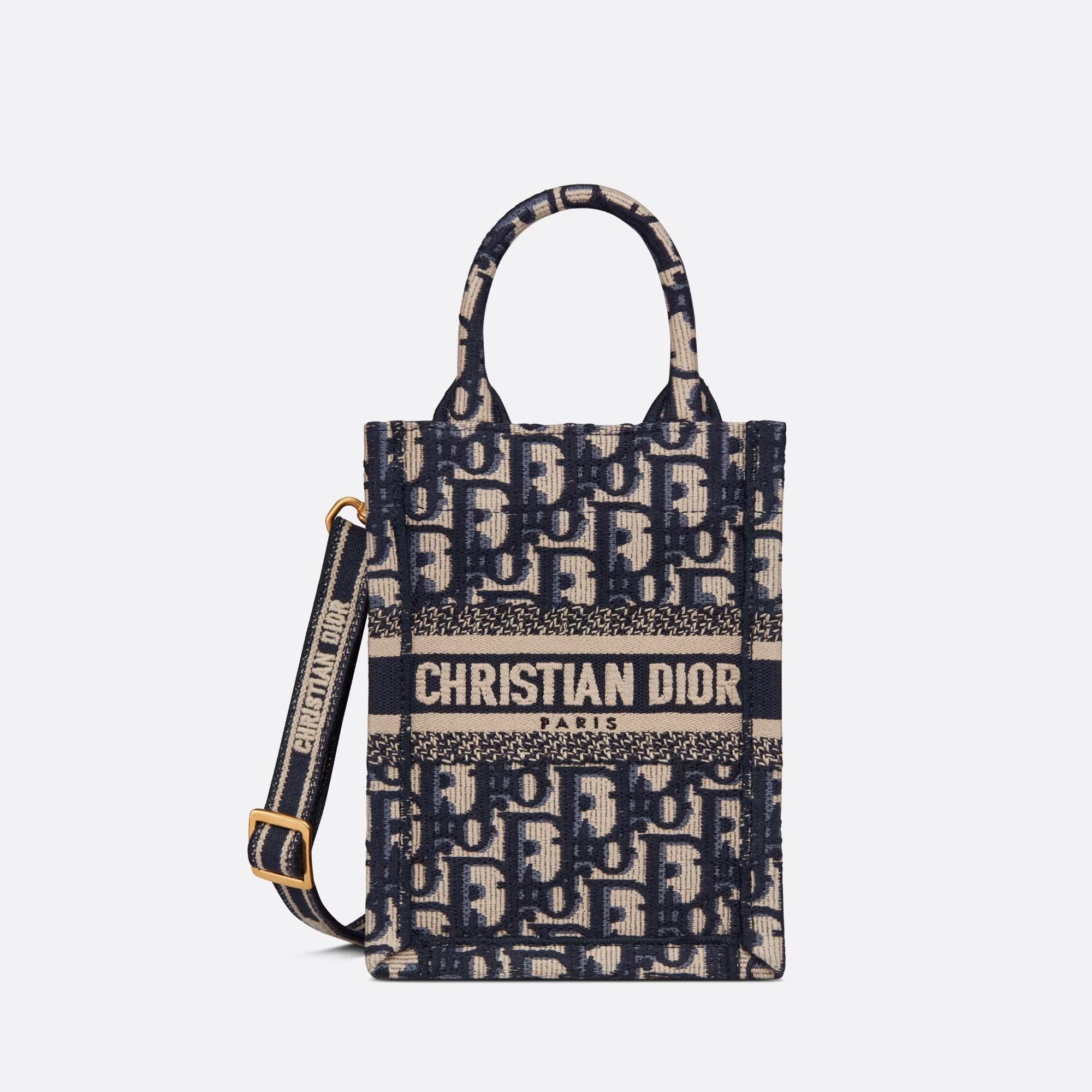Maria Grazia Chiuri’s mini phone bag elevates the iconic Dior Book Tote line. An ideal example of the House’s savoir-faire, the style is entirely embroidered with the blue Dior Oblique motif, and is enhanced by the Christian Dior Paris signature on the front. The bag will accommodate a phone as well as the small daily essentials. Completed by an adjustable and removable embroidered shoulder strap, the modern accessory can be carried by hand, worn over the shoulder or crossbody.