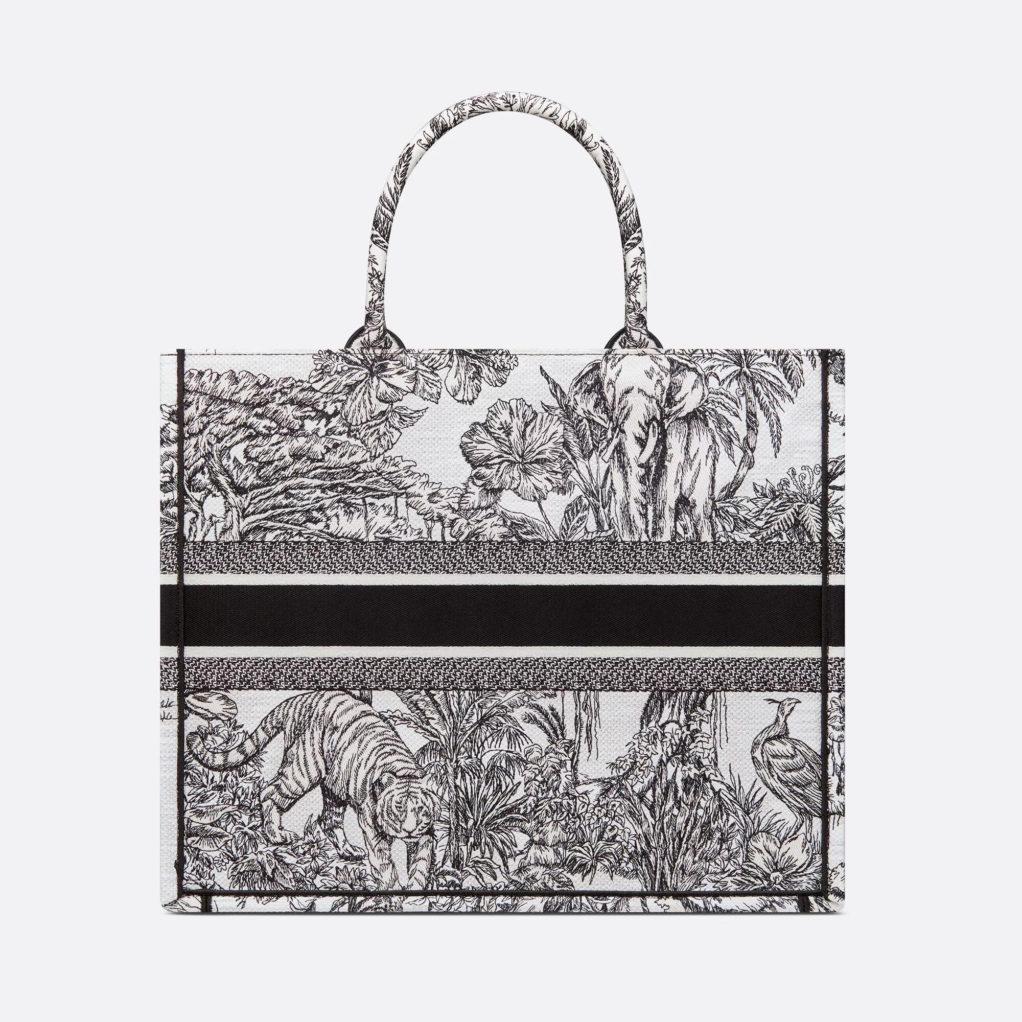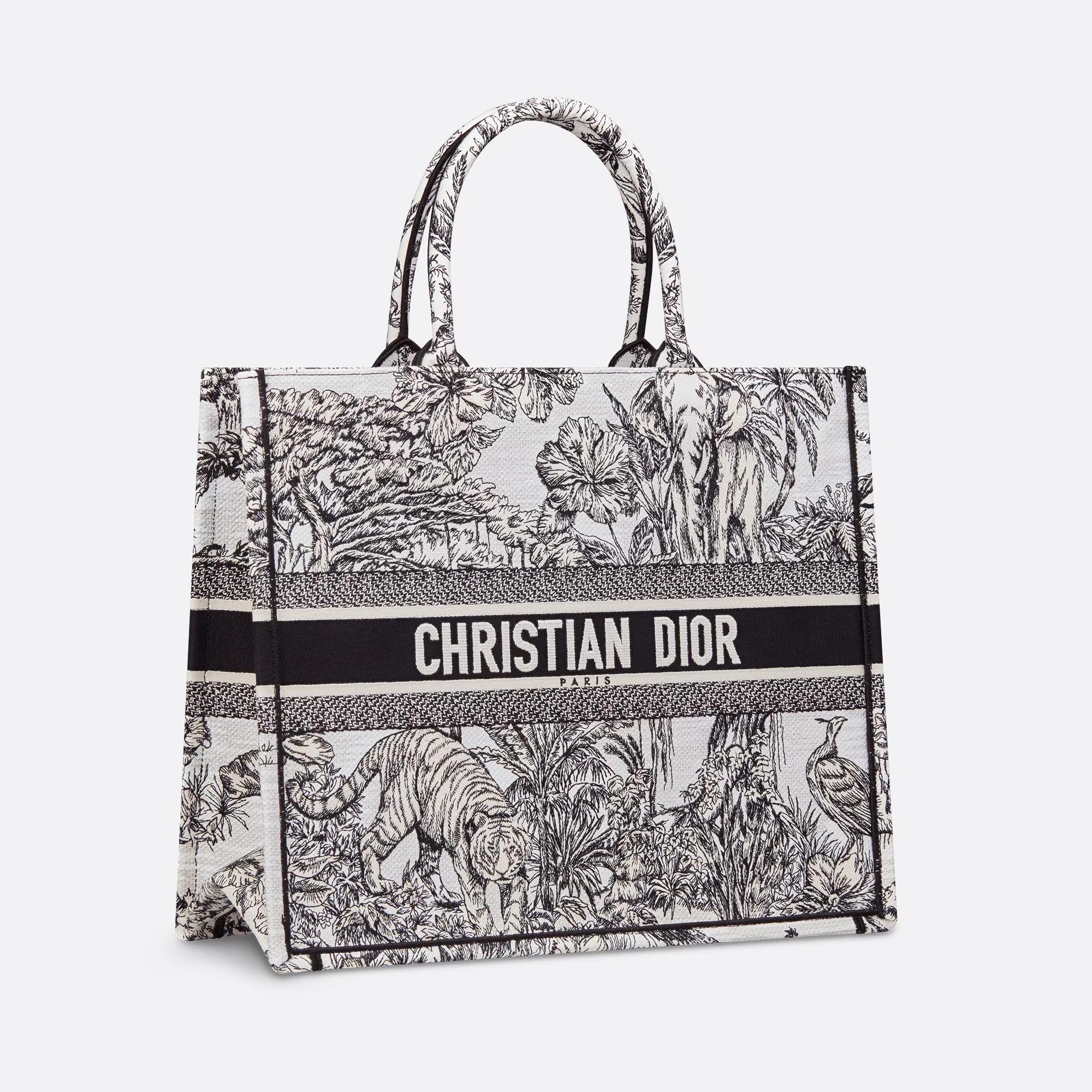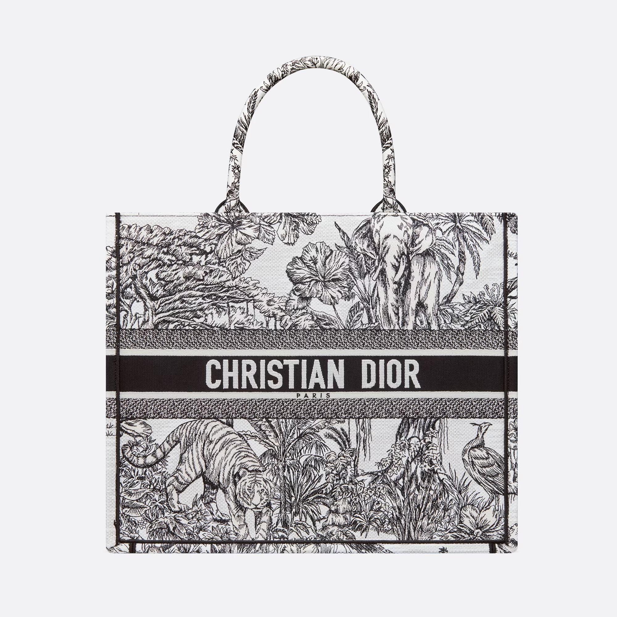 Introduced by Maria Grazia Chiuri, Creative Director of Christian Dior, the Dior Book Tote has become a staple of the Dior aesthetic. Designed to hold all the daily essentials, the white and black style is fully embroidered with the Toile de Jouy Voyage motif by Pietro Ruffo, setting Mr. Dior’s iconic pattern into the heart of Indian flora and fauna. Adorned with the Christian Dior Paris signature on the front, the large tote exemplifiesire and may be carried by hand or worn over the shoulder.